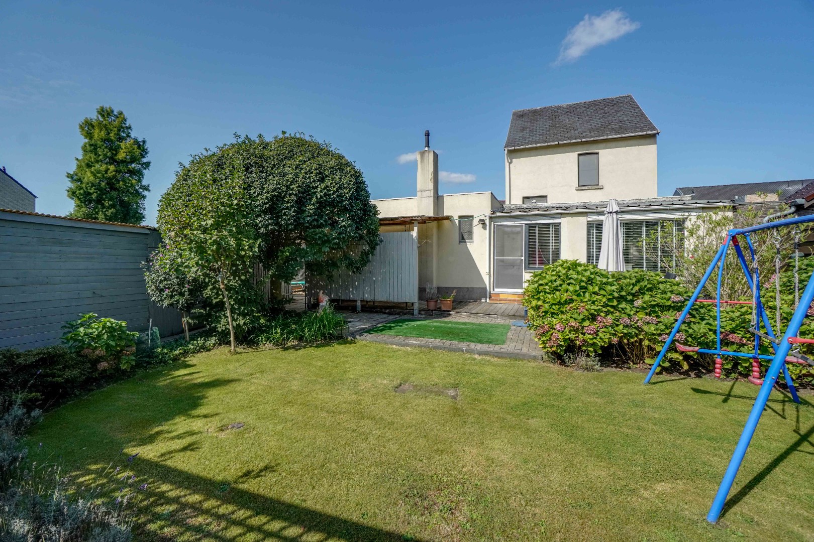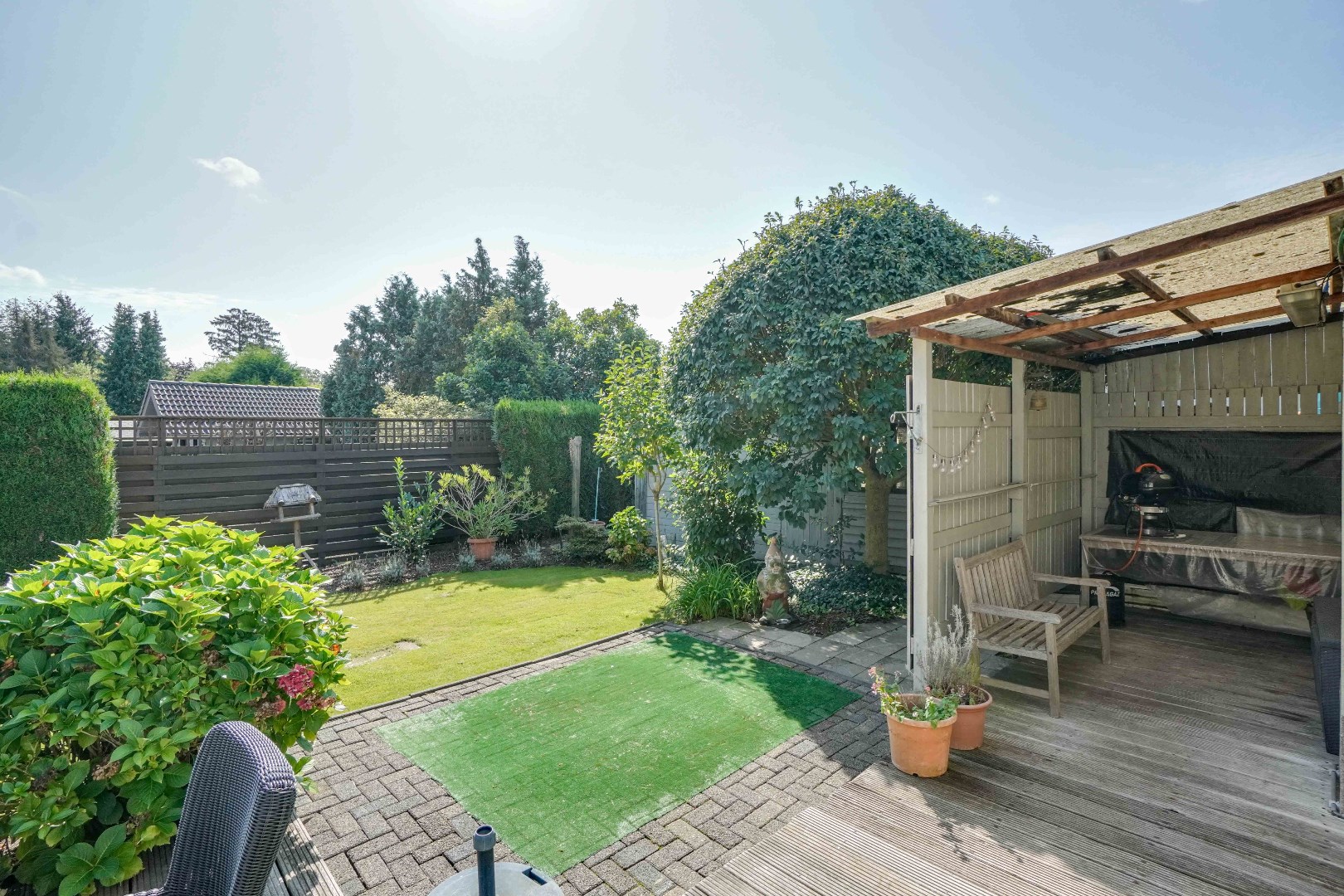 De tuin is voorzien van een deels overdekt terras en fraai aangelegd gazon.
