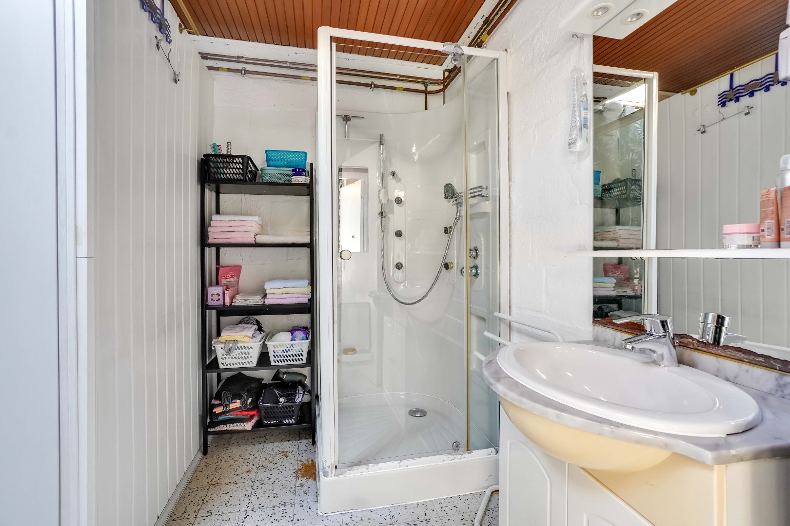 Deze ruimte is naadloos verbonden met de eetkeuken. De keuken is uitgerust met een elektrische kookplaat, afwasmachine, microgolfoven en een oven. Bovendien biedt deze kamer meer dan voldoende ruimte voor het inrichten van een extra eetplaats. Vanuit de keuken is er toegang naar de garage met elektrische poort. De garage verleent op zijn beurt toegang naar de badkamer. De badkamer is momenteel voorzien van een wastafel en douche.