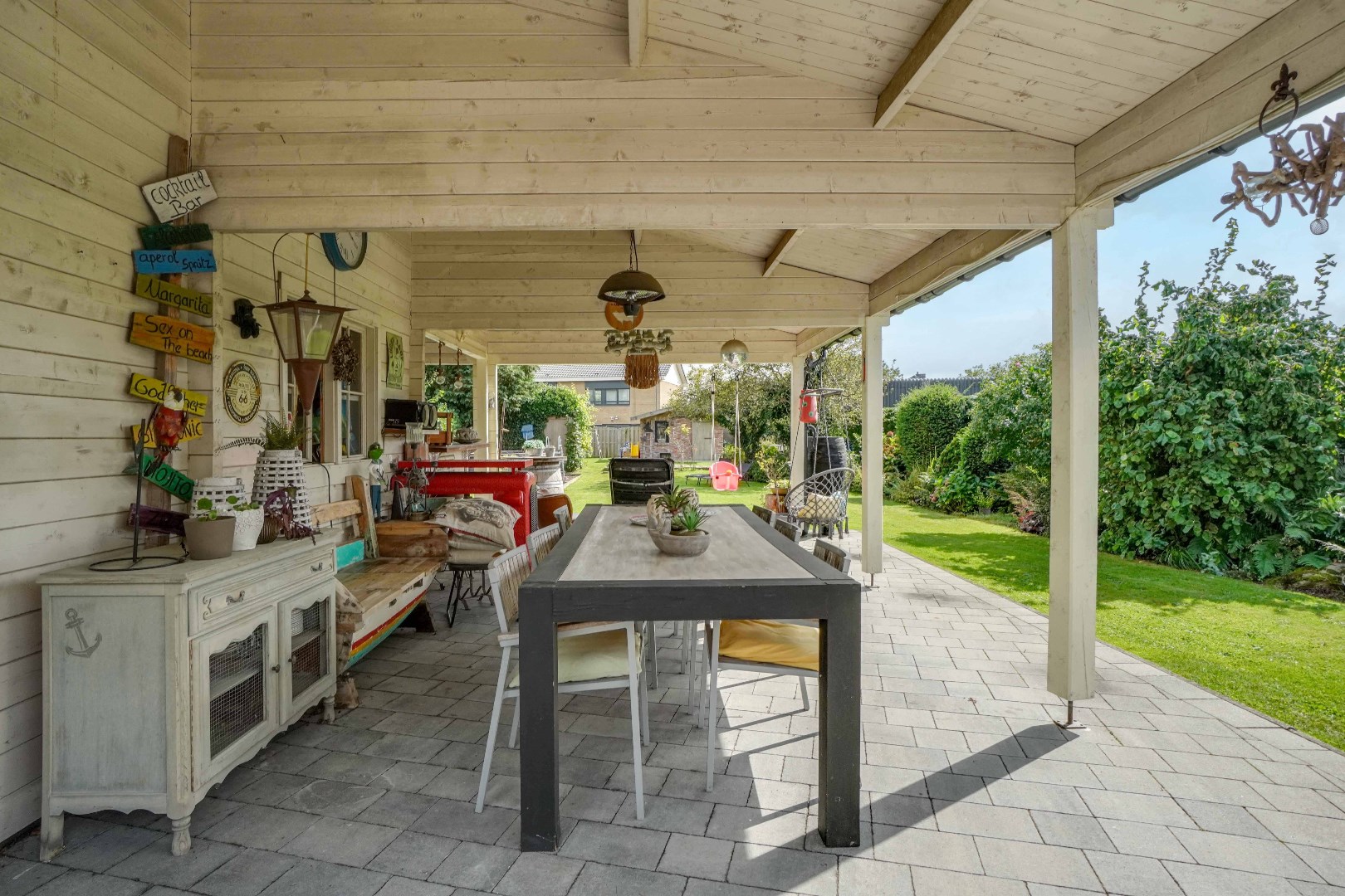 De eyecatcher van de tuin is het overdekt terras met praktische buitenberging.