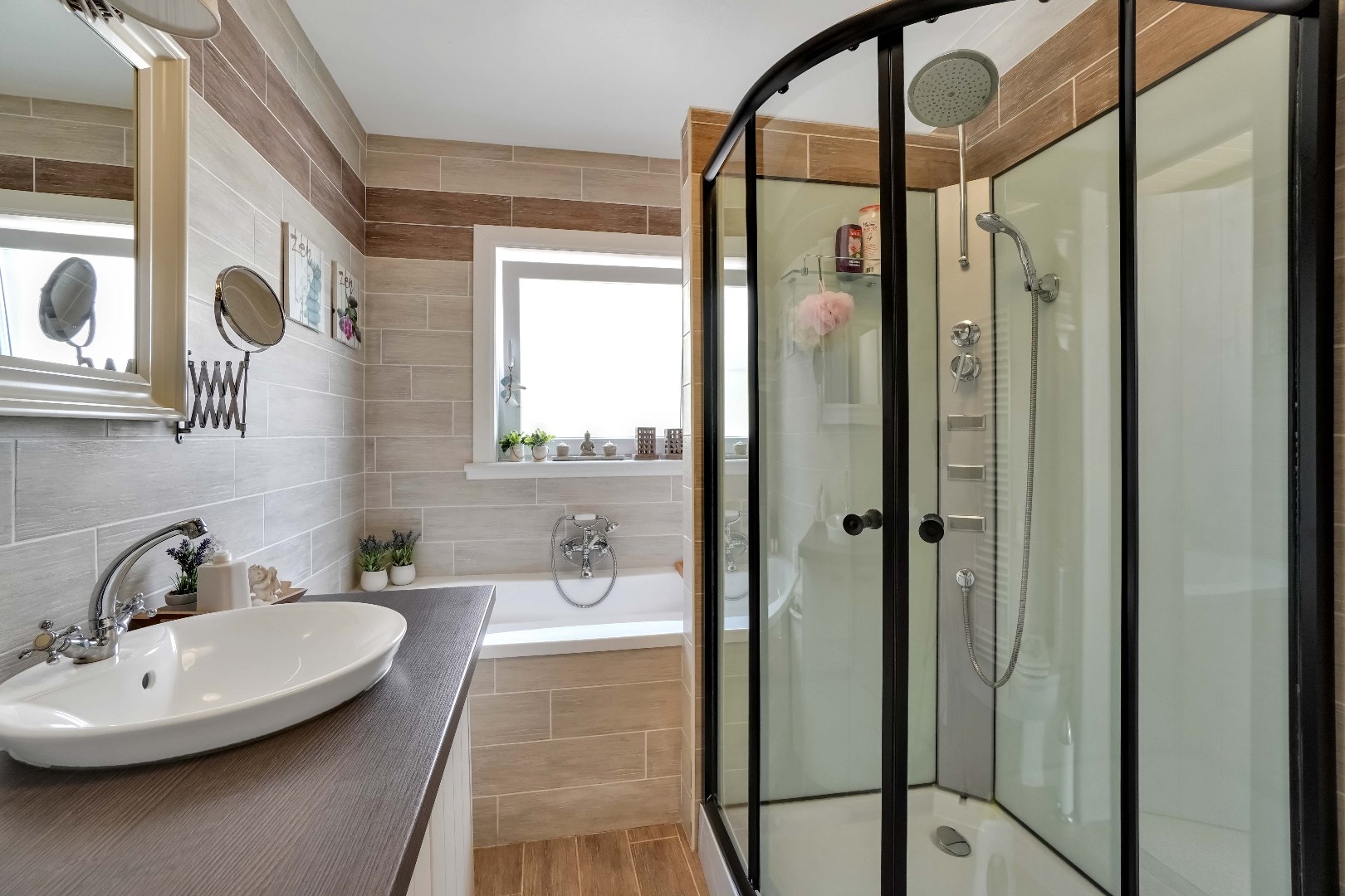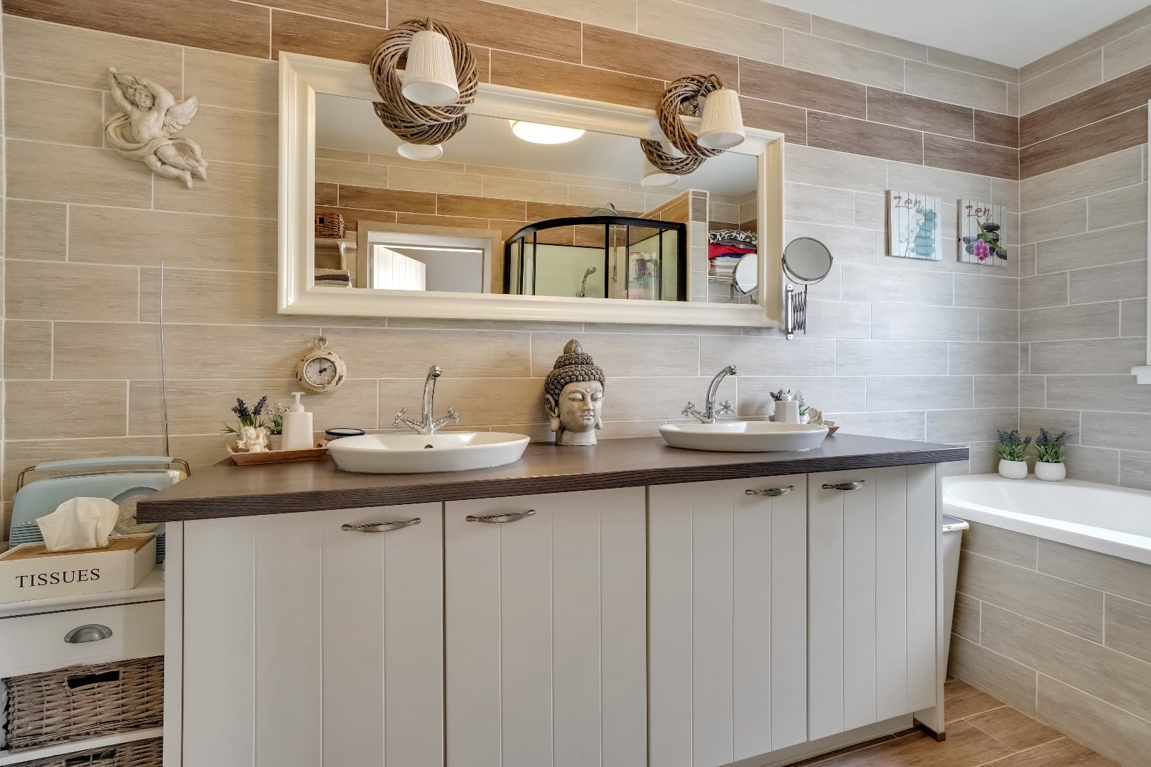 Verder vinden we op het gelijkvloers de badkamer terug. Deze is voorzien van een dubbele lavabo, ligbad, douche en toilet. Er is bovendien nog een tweede toilet aanwezig op het gelijkvloers, zijnde in een aparte ruimte.