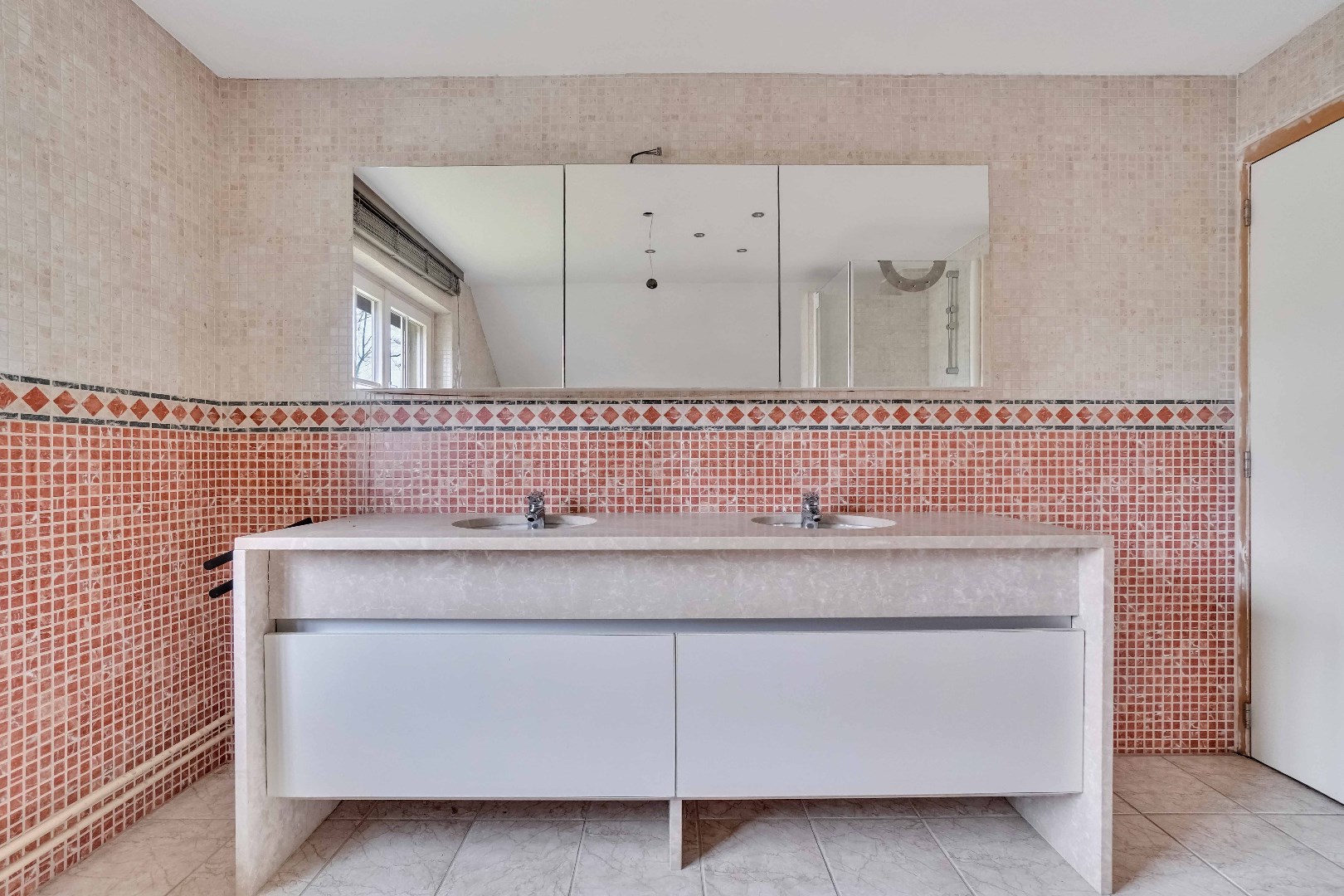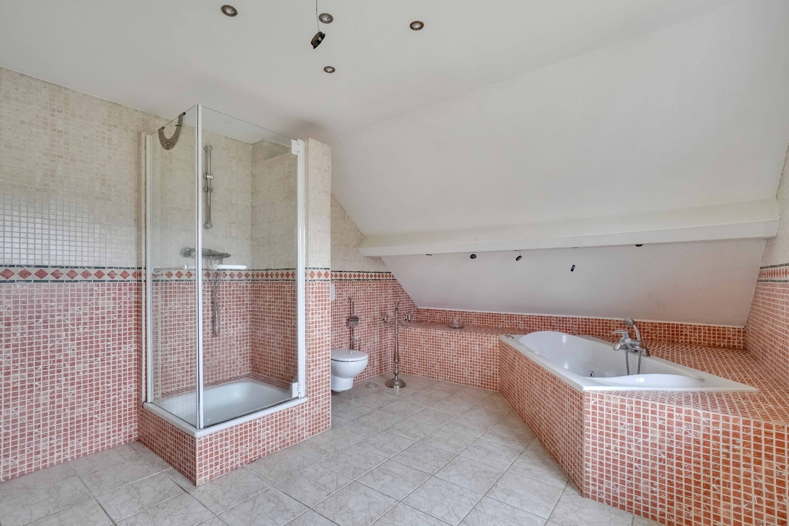 De ruime badkamer is uitgerust met een dubbele wastafel, ligbad, douche en toilet.