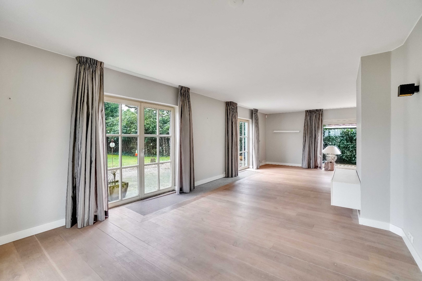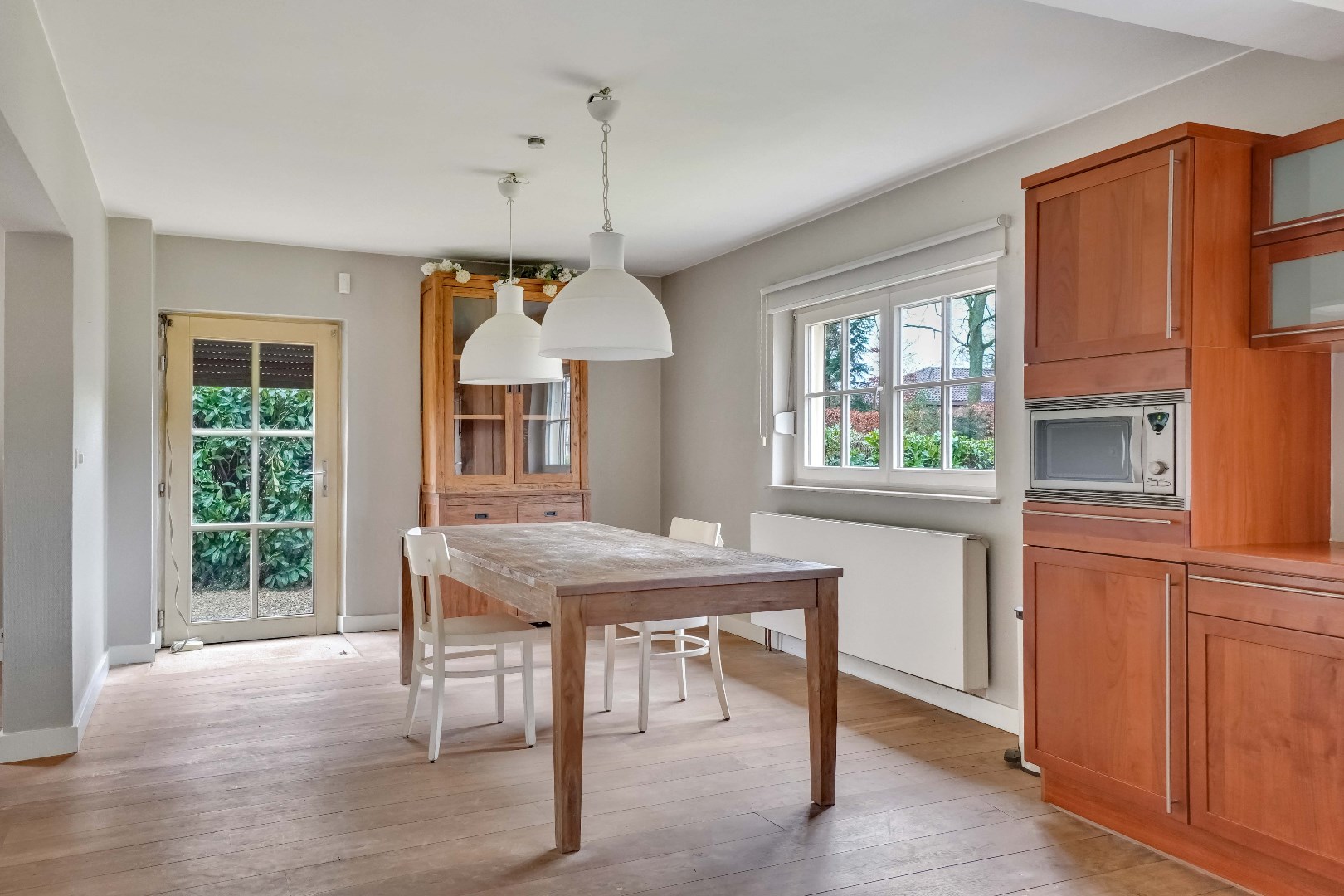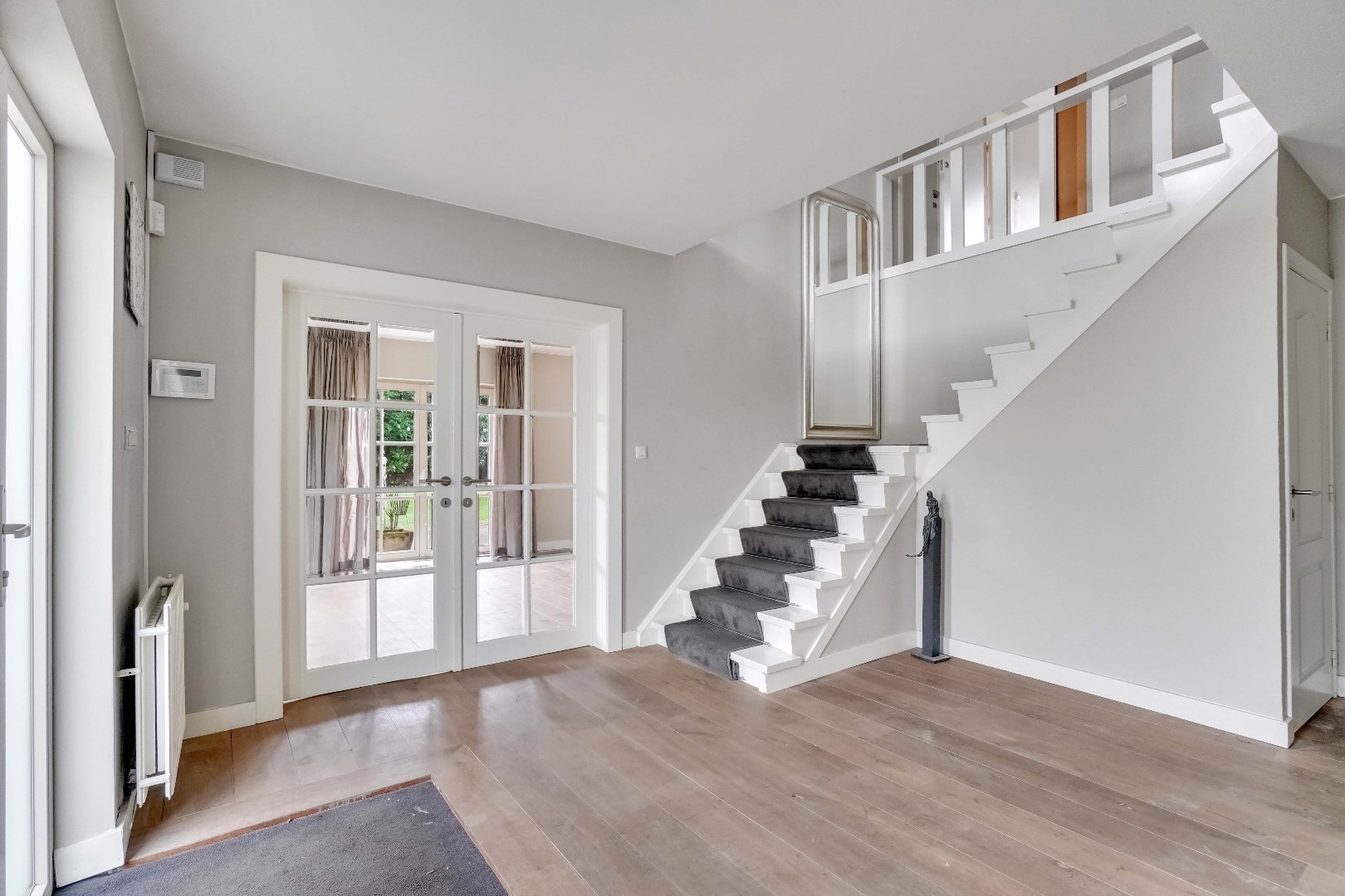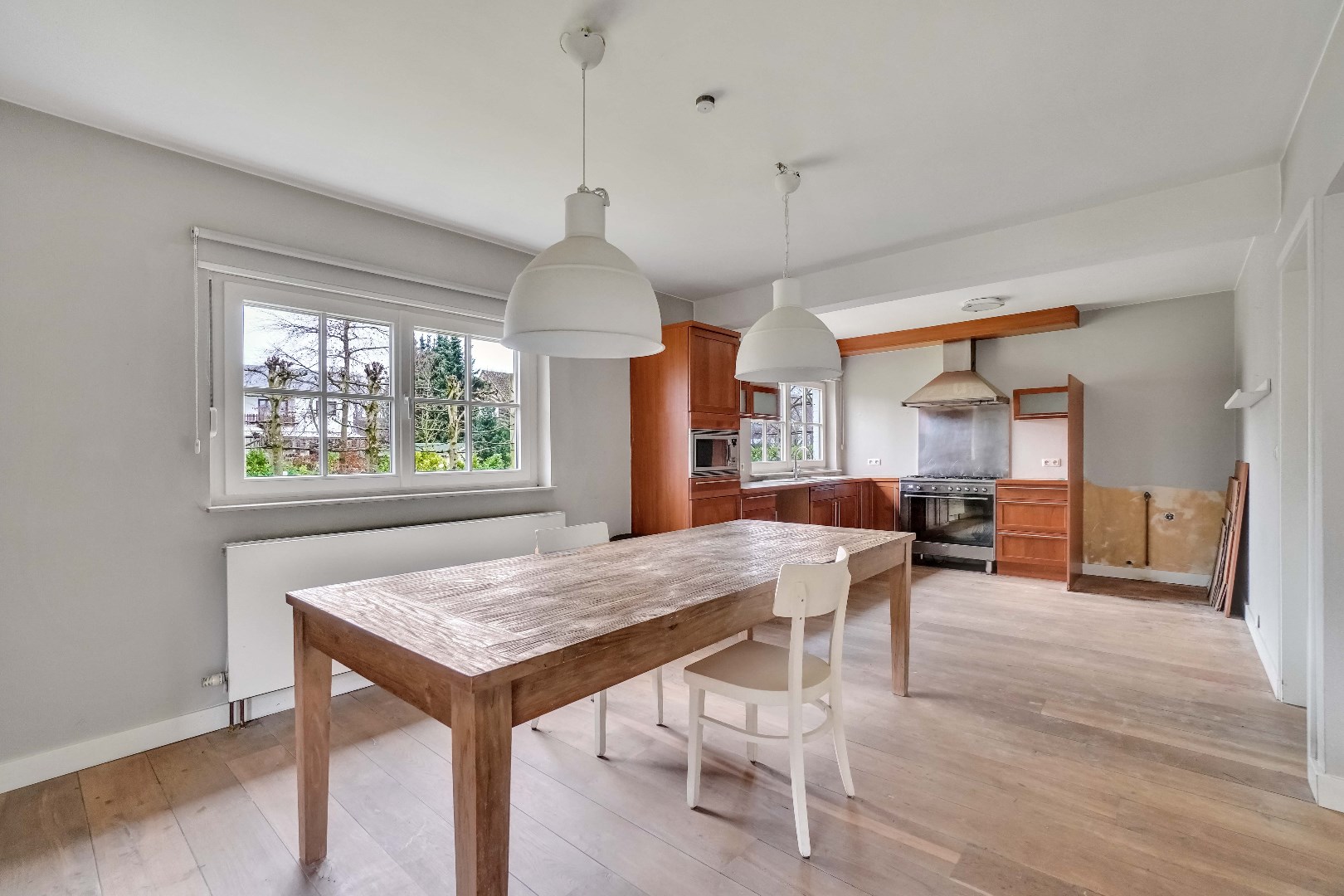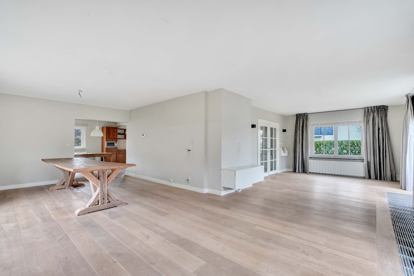 De ruime inkomhal met gastentoilet geeft toegang tot de lichtrijke woonkamer, waar de grote raampartijen zorgen voor een aangename lichtinval. Aansluitend bevindt zich de eetruimte, dewelke verbonden is met de open keuken. De keuken is volledig naar eigen smaak en wensen in te richten.