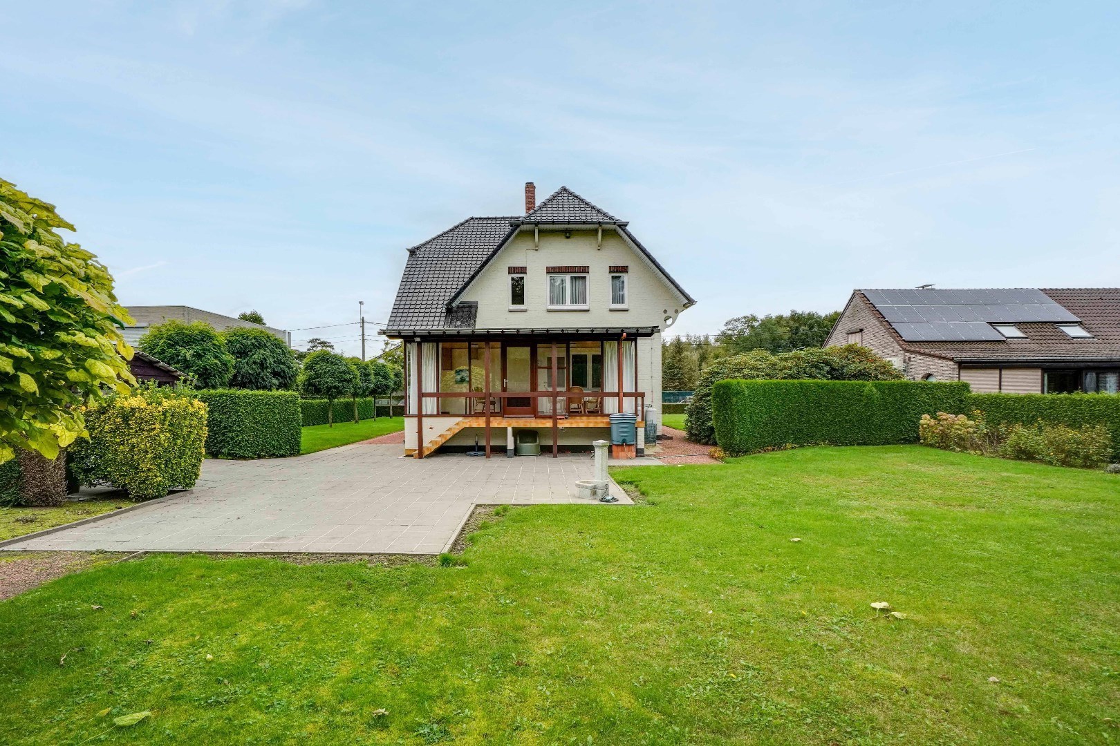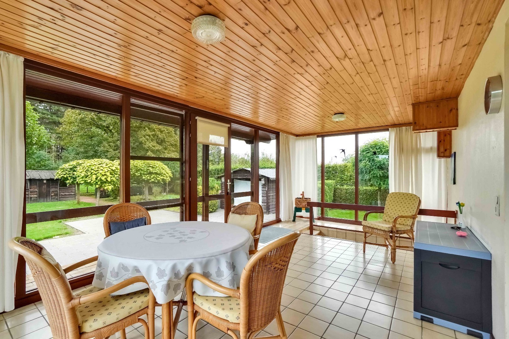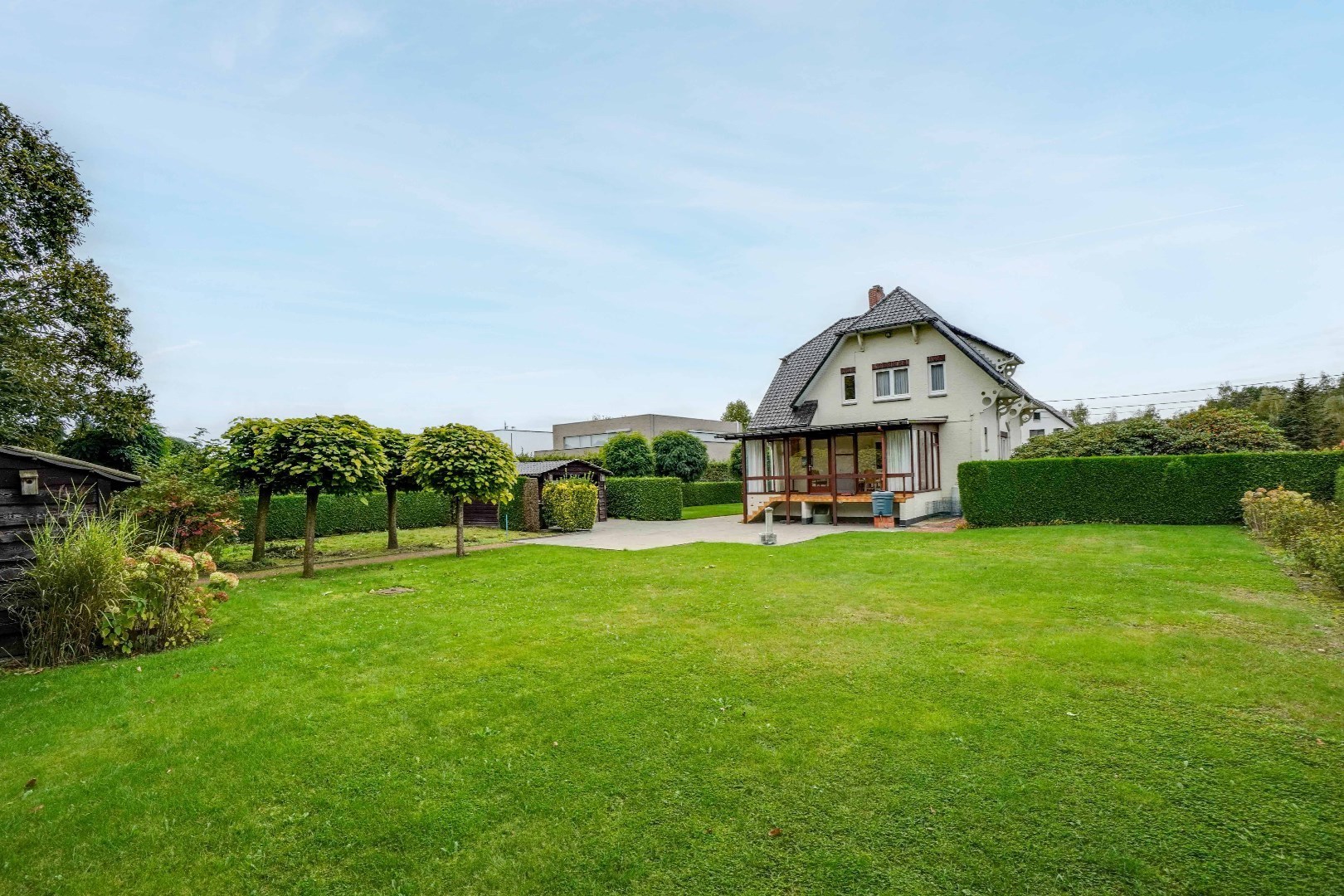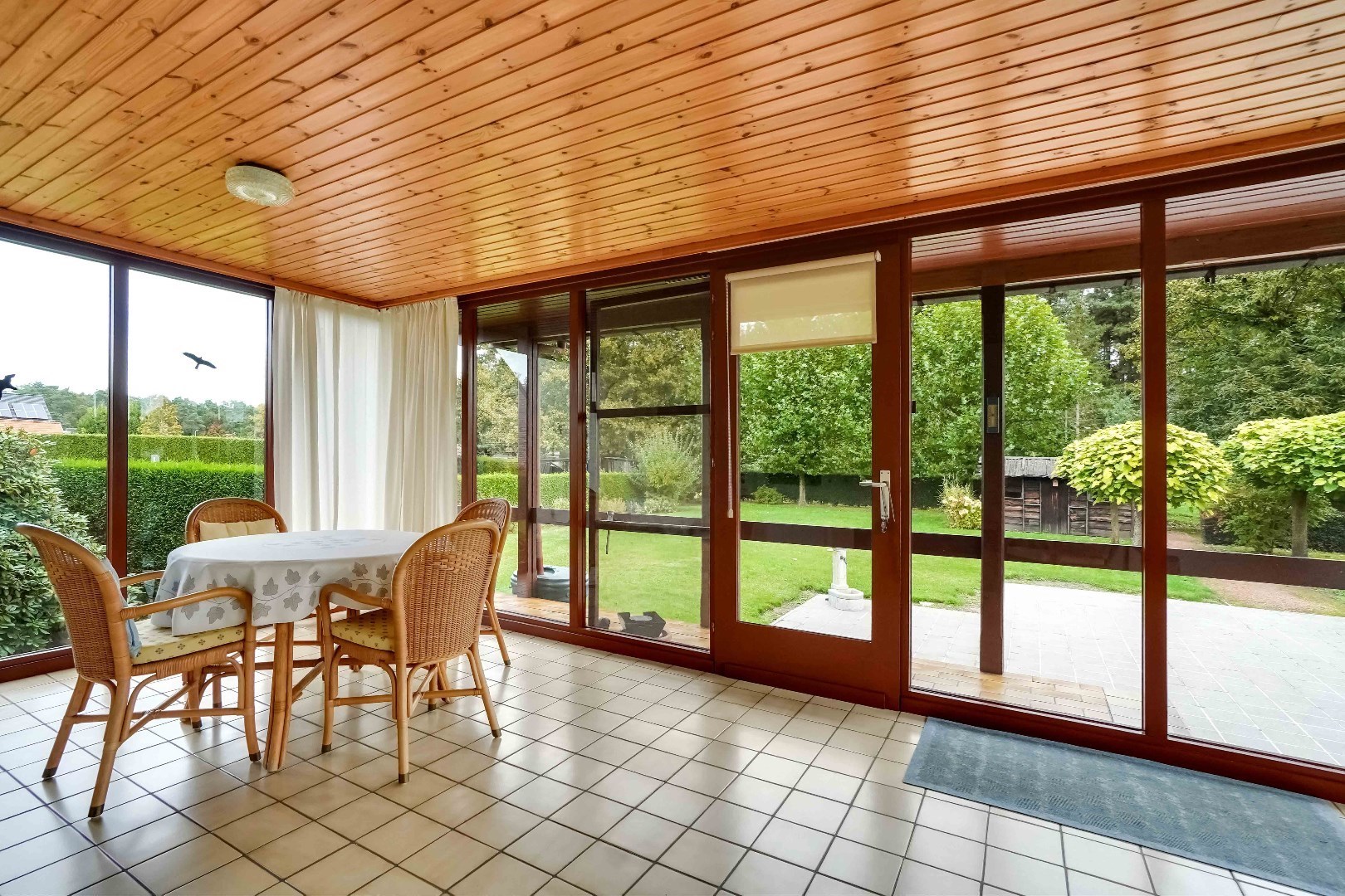De veranda, met een oppervlakte van +/- 21 m², biedt wijds zicht op de prachtig aangelegde tuin.