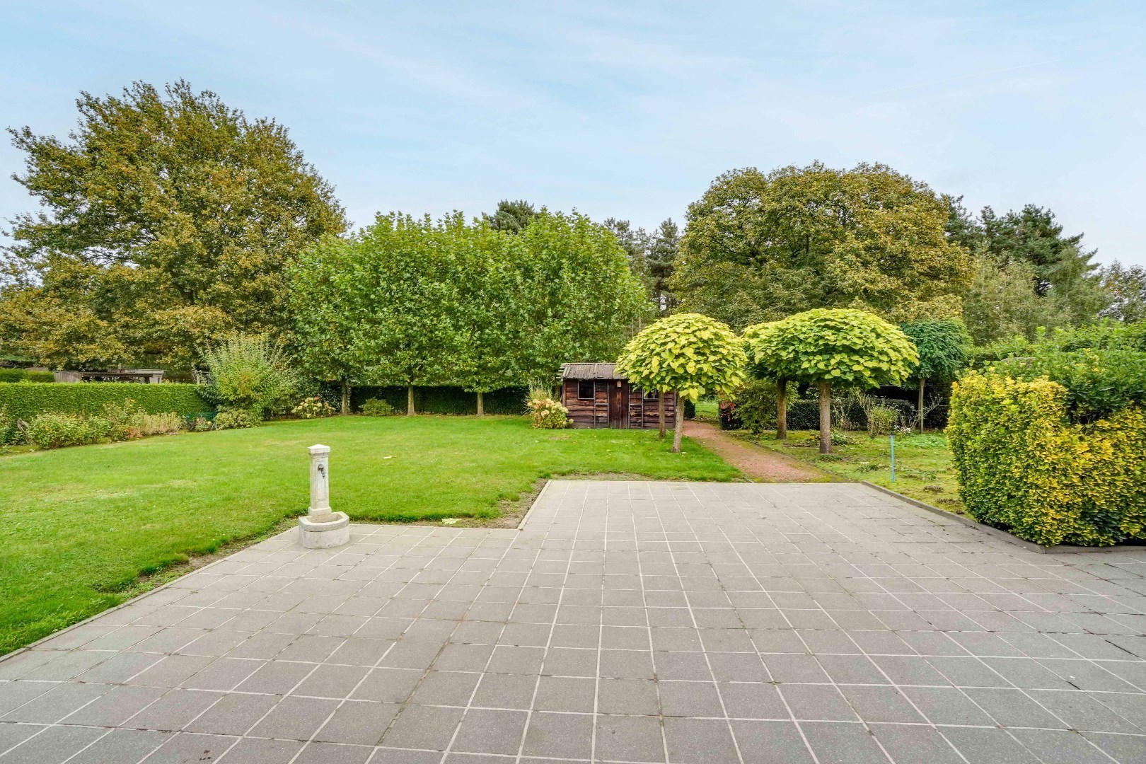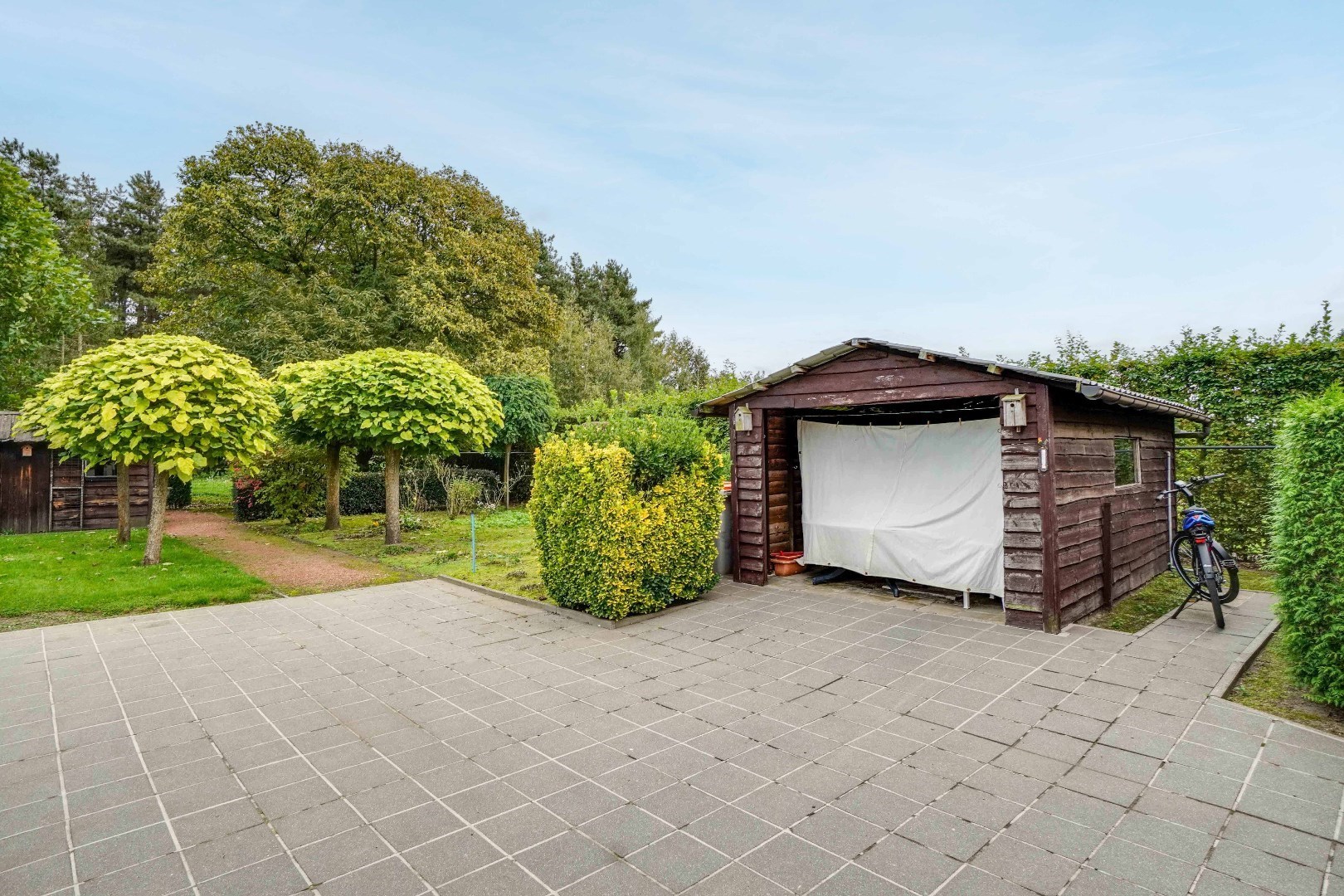 De tuin is volledig omheind met groen, waardoor men kan genieten van voldoende privacy. Daarnaast zijn er ook 2 praktische tuinhuizen aanwezig, ideaal voor het opbergen van fietsen, materiaal, etc.