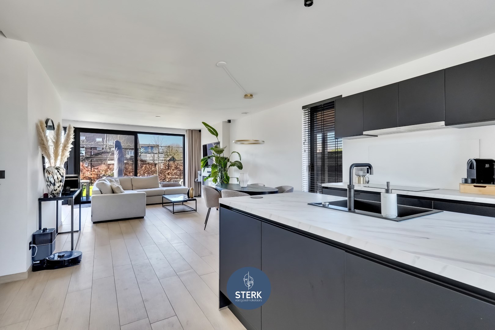 Via de inkomhal met gastentoilet betreedt men de open leefruimte, bestaande uit een gezellige woonkamer met elektrische haard en uitzicht op de tuin. Aansluitend vindt men de eetruimte en een volledig uitgeruste keuken met moderne toestellen zoals een elektrische kookplaat, quooker, ingebouwde koelkast, afwasmachine, oven en magnetron. Verder is er op het gelijkvloers ook een praktische berging en directe toegang tot de tuin.