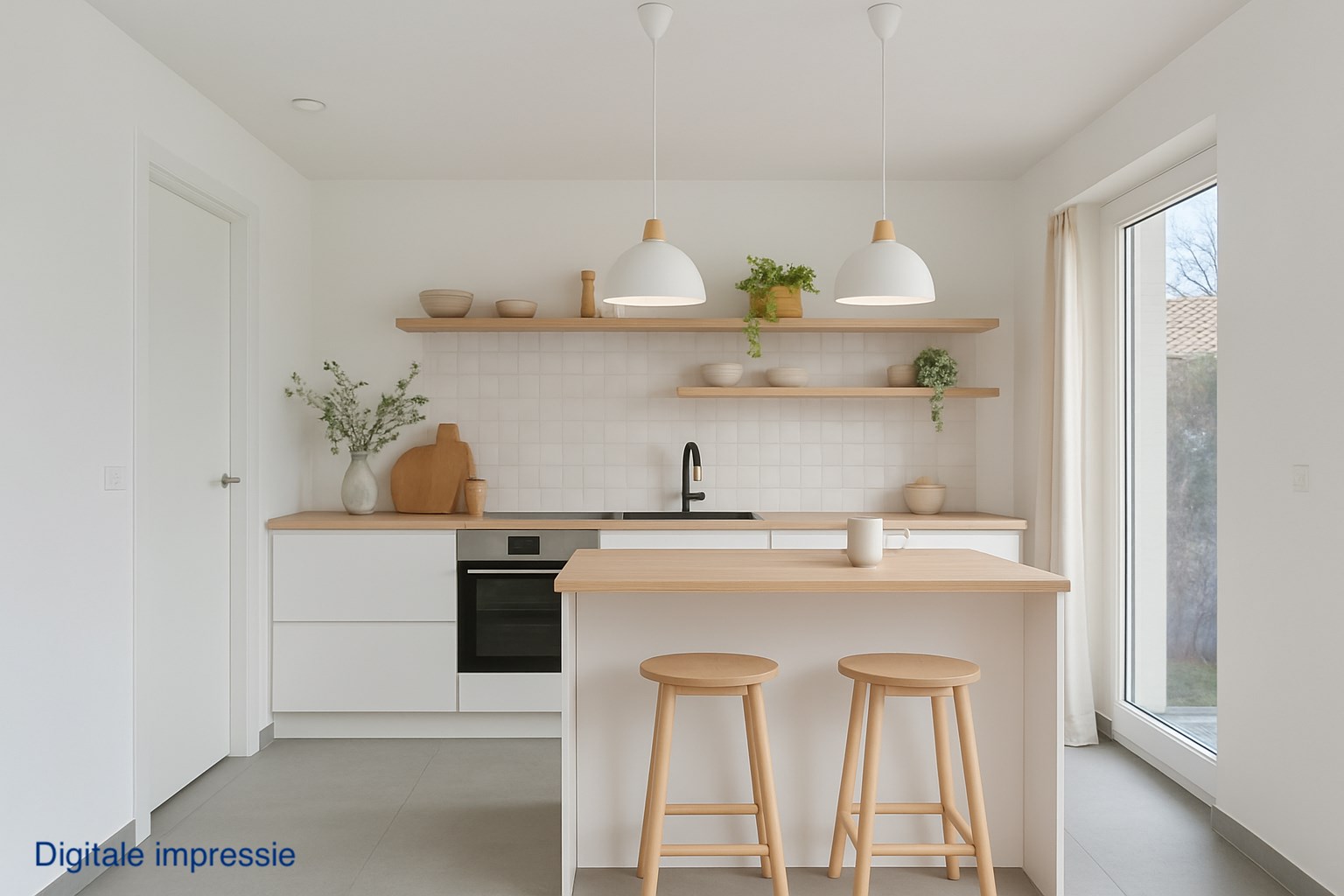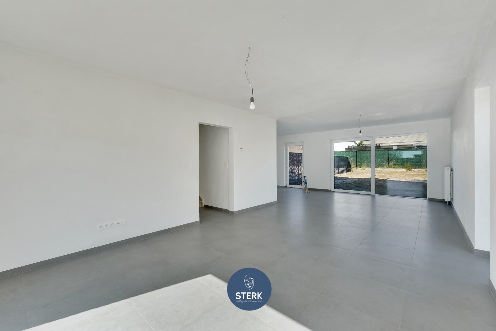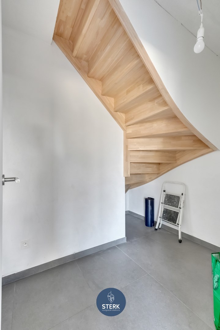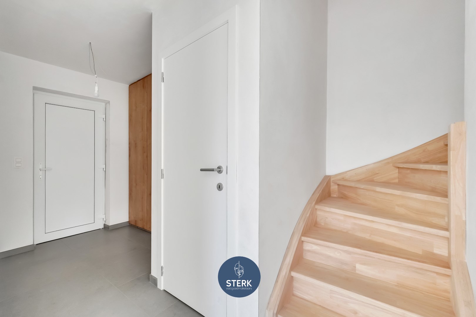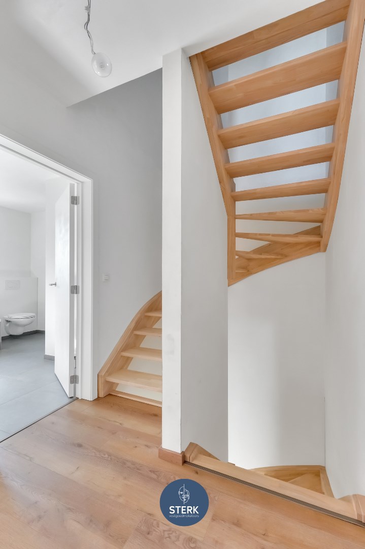Via de inkomhal met gastentoilet en vestiaireruimte, betreedt men de leefruimte. De leefruimte is overgoten met natuurlijk licht dankzij de grote raampartijen en voorziet bovendien voldoende ruimte voor het inrichten van een zit- en eethoek met open keuken. Deze woning biedt de kans om uw eigen droomkeuken te plaatsen aangezien deze momenteel nog niet voorzien is. Verder is er op het gelijkvloers ook een praktische berging aanwezig met aansluiting voor wasmachine en droogkast.