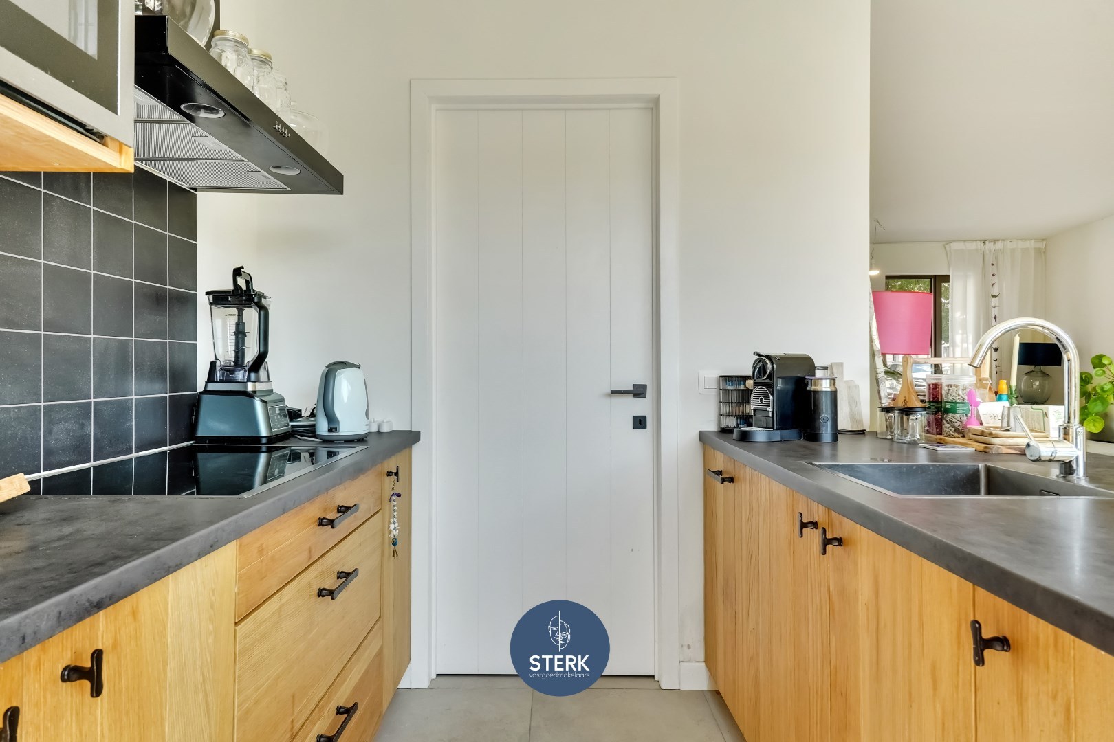 Bij het betreden van de woning komt men terecht in de inkomhal met gastentoilet. De ruime woonkamer en eetruimte zijn bijzonder lichtrijk dankzij de grote raampartijen die zorgen voor een open gevoel en een mooi zicht op de tuin. Aansluitend bevindt zich de open keuken met een elektrische kookplaat, ingebouwde koelkast en afwasmachine. Vanuit de keuken is er toegang naar de praktische berging/wasplaats.