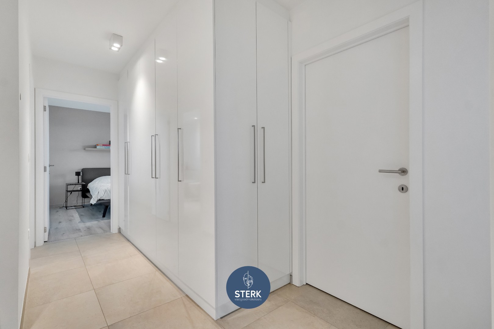 Bij binnenkomst betreedt men de inkomhal met gastentoilet. De ruime leefkeuken vormt het hart van de woning en is uitgerust met een natuurstenen werkblad en hoogwaardige toestellen van NEFF, waaronder een inductiekookplaat, ingebouwde koelkast, afwasmachine en combi-oven.