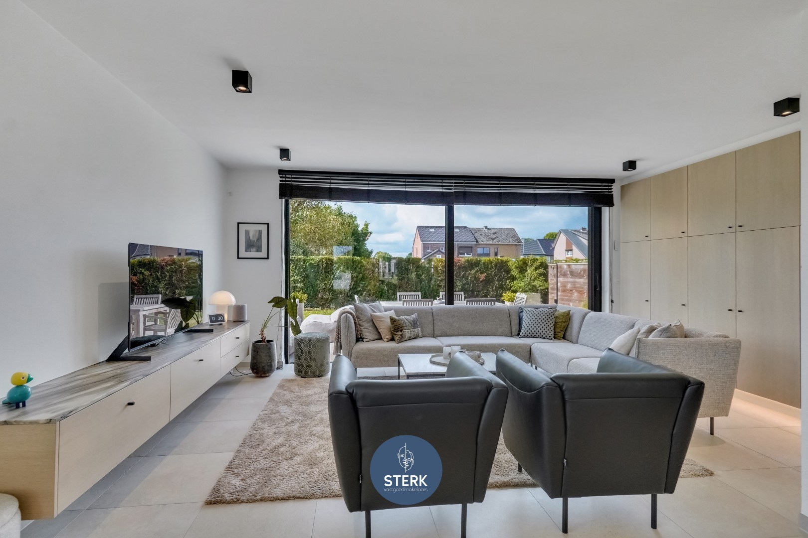 Via de eetruimte is er een open verbinding naar de lichtrijke woonkamer met grote schuiframen, dewelke direct toegang bieden tot het terras en de tuin. Zowel in de woonkamer als in de hal zorgen ingebouwde kasten voor extra opbergruimte. De woonkamer is bovendien voorzien van airconditioning. Aansluitend vindt men een praktische wasruimte.