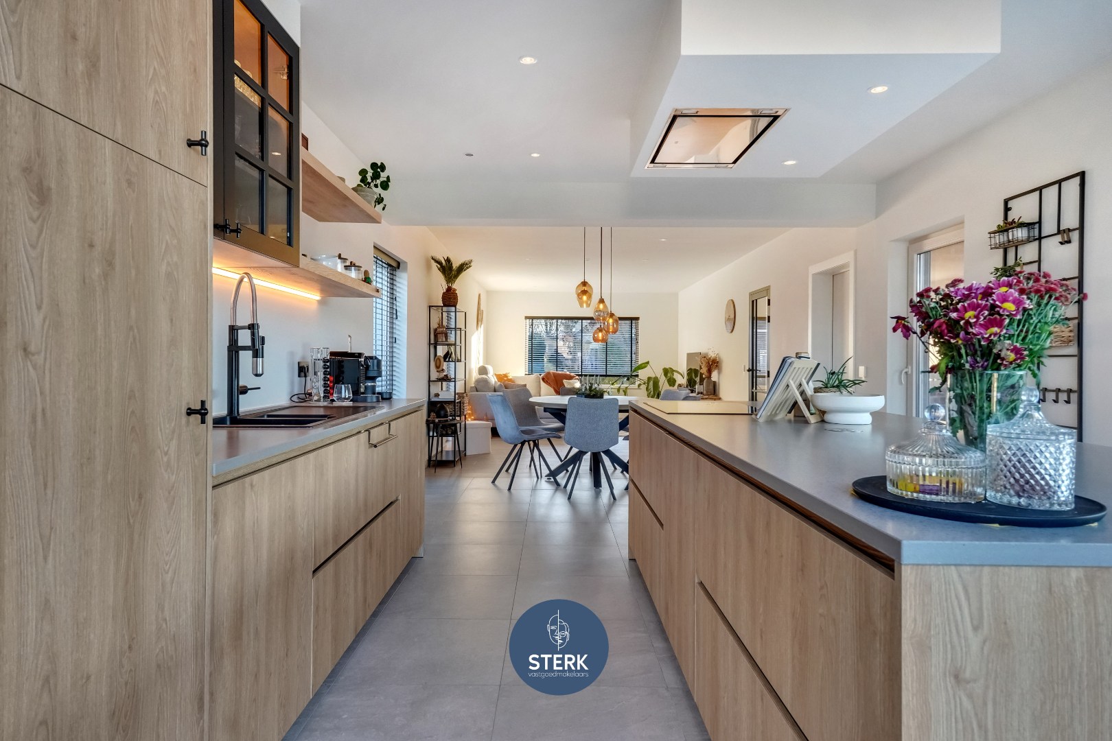 Bij het betreden van de woning verleent de inkomhal toegang tot de leefruimte. De woonkamer sluit naadloos aan op de eetruimte en vormt samen een ruime en lichtrijke leefomgeving. Aansluitend bevindt zich de moderne keuken met zicht op de tuin, dewelke volledig uitgerust is met een inductiekookplaat, koelkast, afwasmachine, oven en magnetron. Verder beschikt het gelijkvloers nog over een praktische wasruimte en een apart toilet.