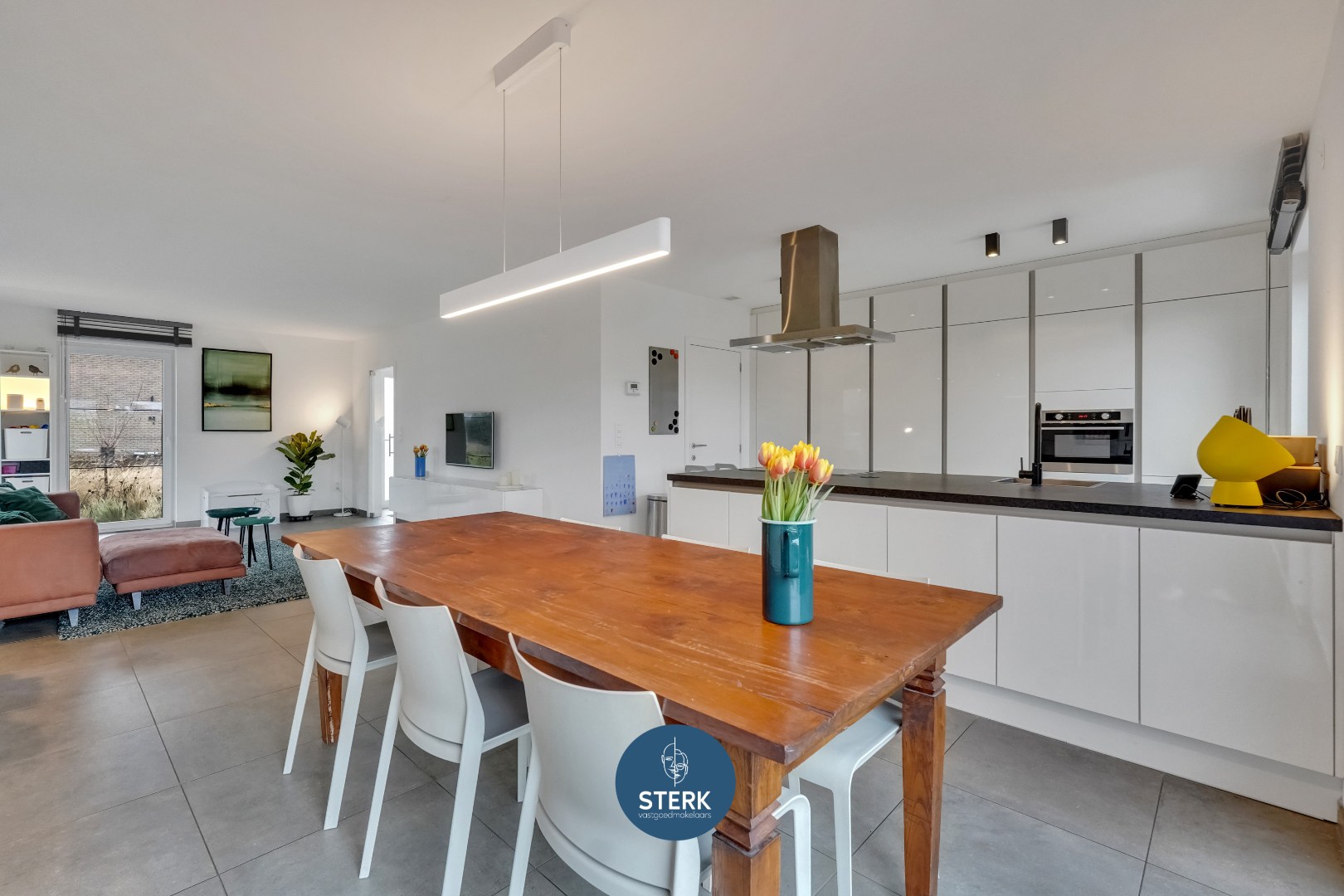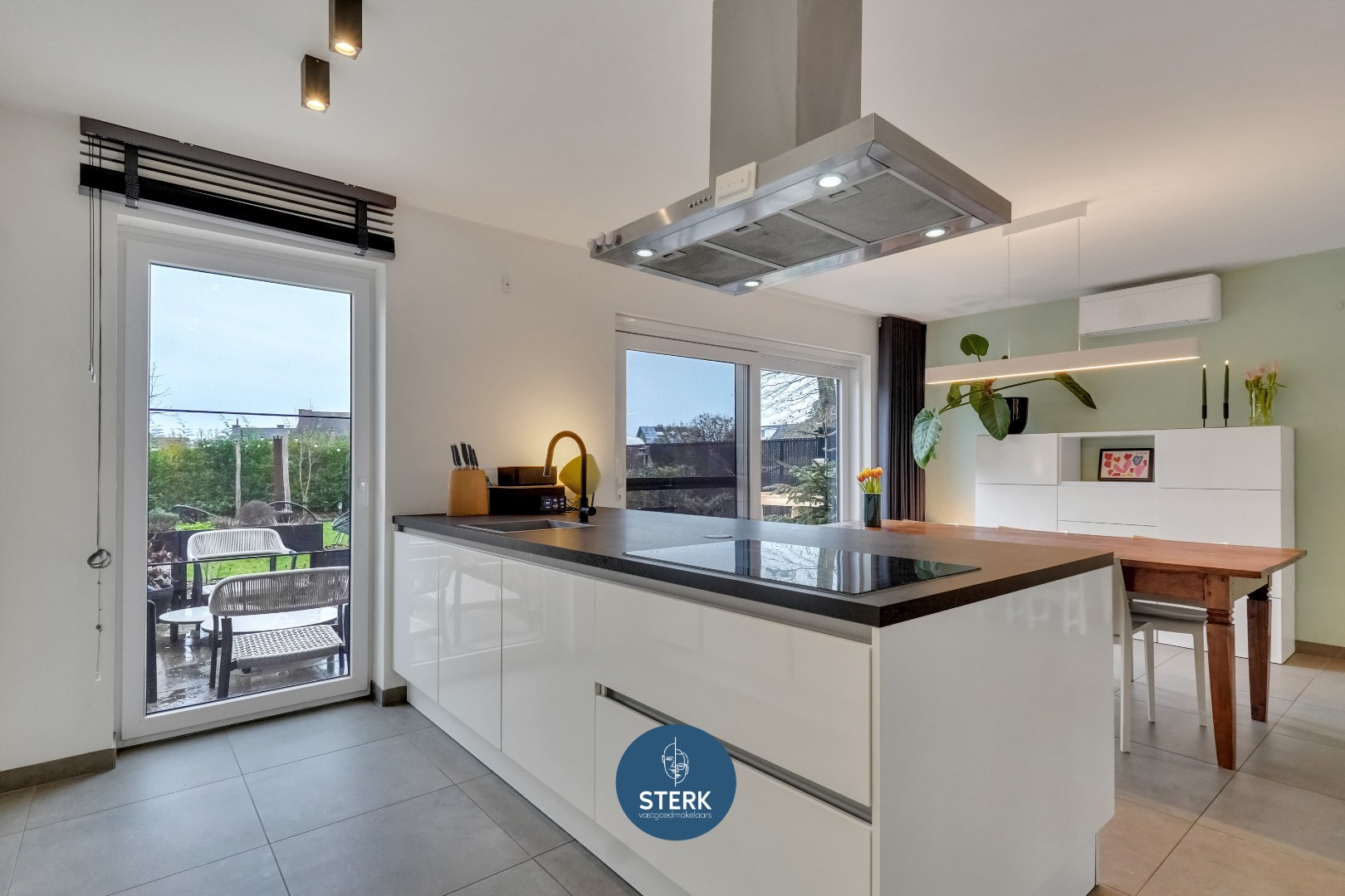Het gelijkvloers is ingericht met een open en lichtrijke leefruimte, die naadloos overgaat in de keuken. De moderne keuken is volledig uitgerust met een inductiekookplaat, ingebouwde koelkast en diepvriezer, afwasmachine en een combi-oven. Dankzij de overvloed aan werkblad en bergruimte is deze keuken zowel praktisch als comfortabel ingericht. Aansluitend bevindt zich de berging.