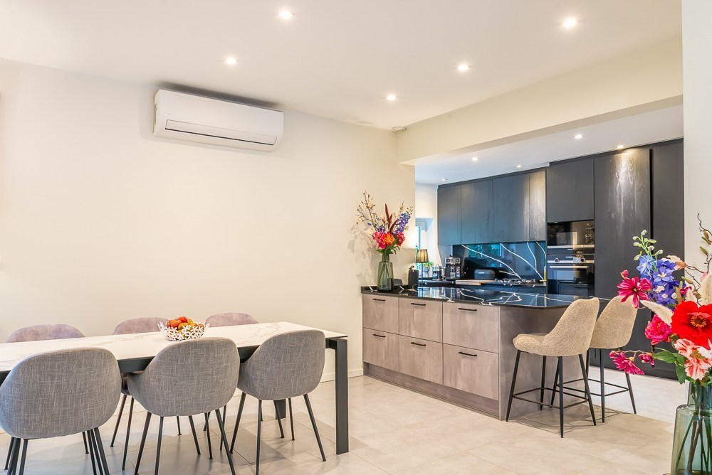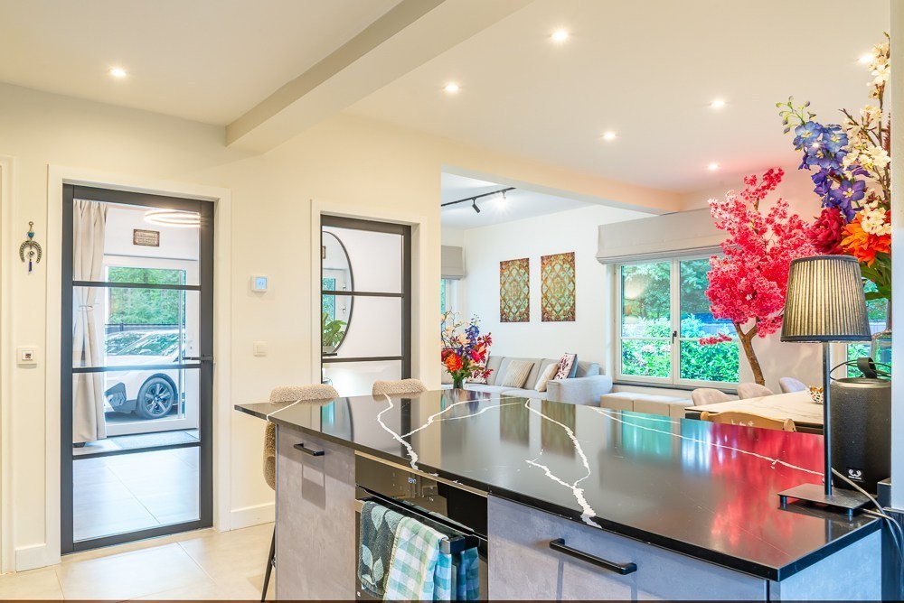 Bij binnenkomst wordt men verwelkomd in het leefgedeelte met een lichte, open woon- en eetruimte dewelke naadloos overloopt in de keuken. De keuken, volledig vernieuwd in 2024, is voorzien van een natuurstenen werkblad, gasfornuis, ingebouwde koelkast, afwasmachine, magnetron en combi-oven. Aansluitend bevindt zich een praktische berging en wasruimte, met vanuit de berging directe toegang tot het overdekte terras.