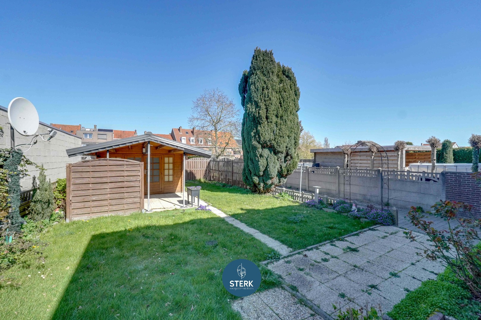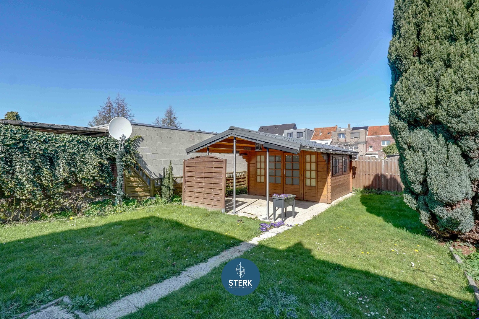 Tot slot beschikt de woning over een aangename tuin, ingericht met een combinatie van gazon en terras. Achteraan het perceel is er bovendien een praktische toegang via “Het Hofje”, wat extra mogelijkheden biedt. De tuin is eveneens voorzien van een tuinhuis.
