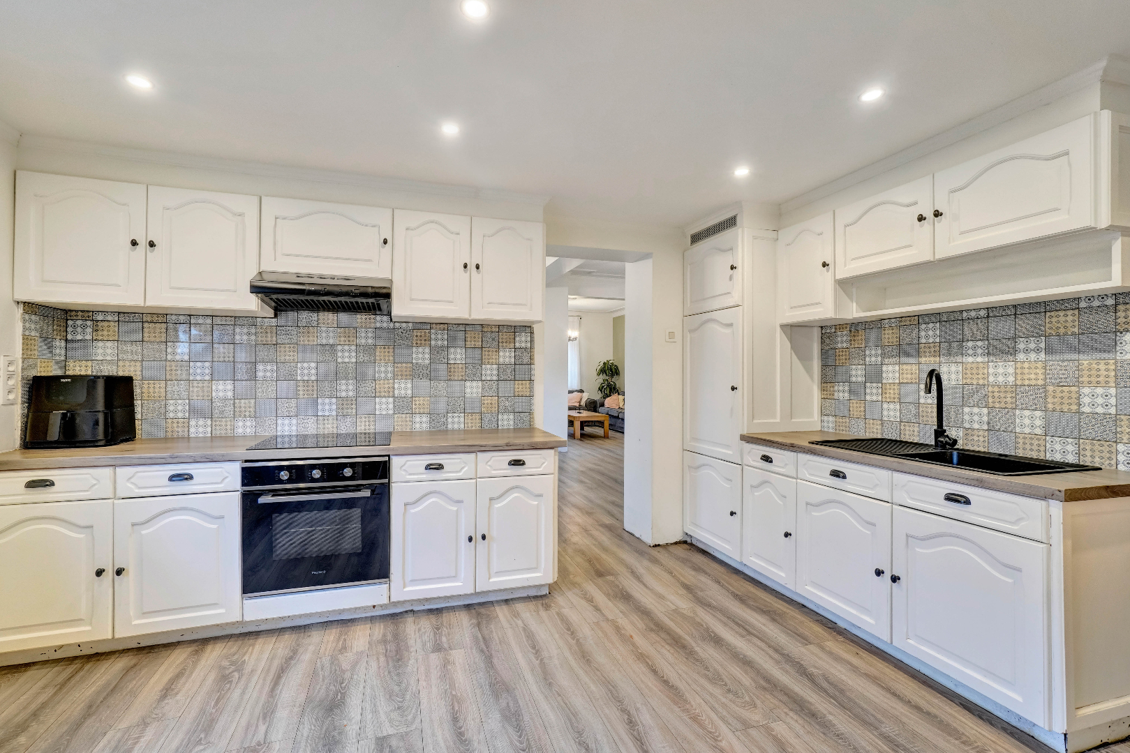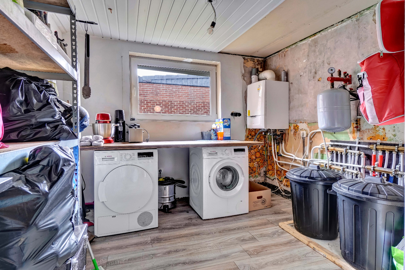 Via de inkomhal heb je toegang tot de grote woonruimte met eetkamer. De achtergelegen keuken is voorzien van alle toestellen en geeft zicht op de zijtuin. Verder zijn er een wasruimte, badkamer en gastentoilet op de gelijkvloerse verdieping aanwezig.