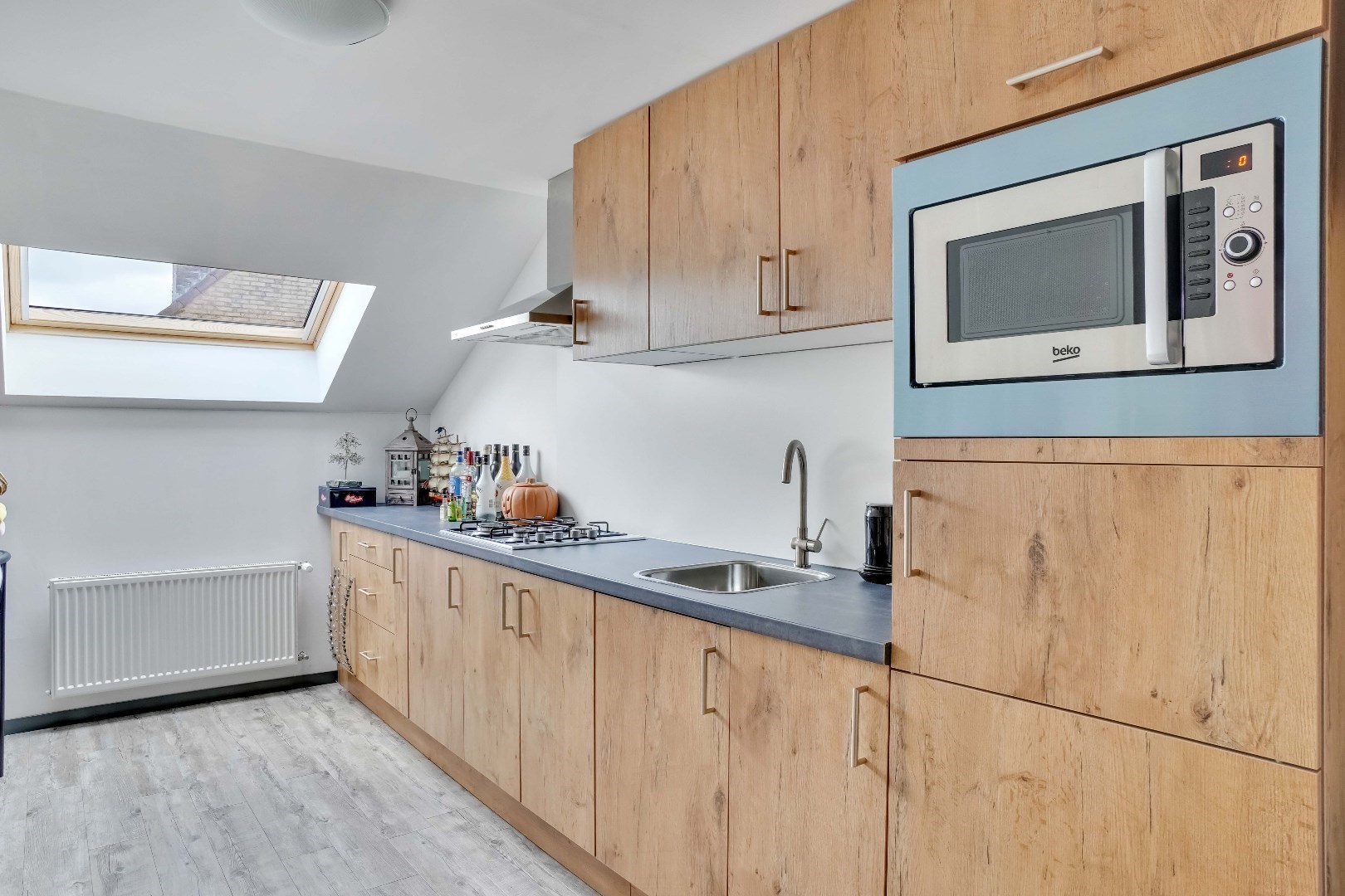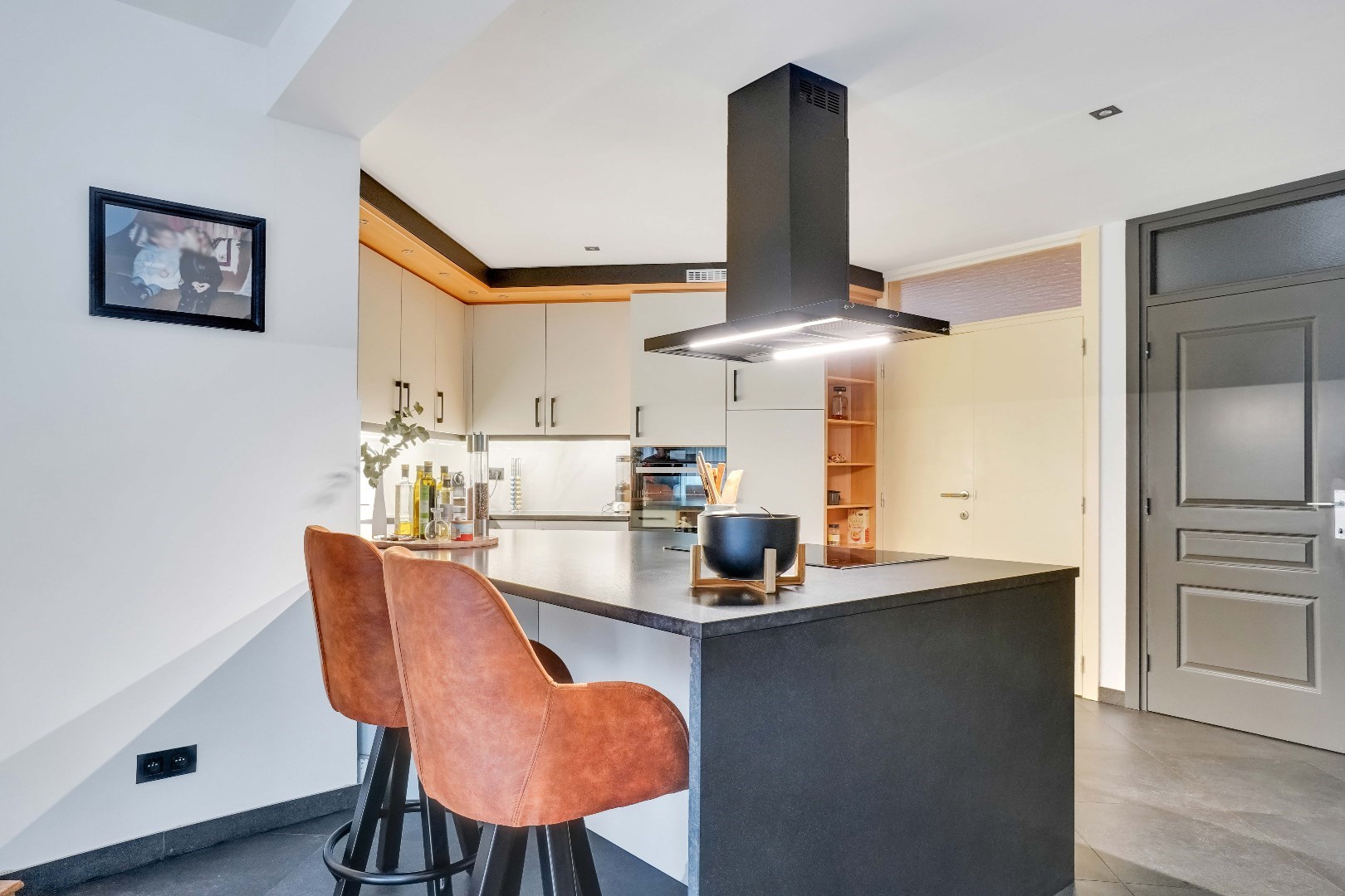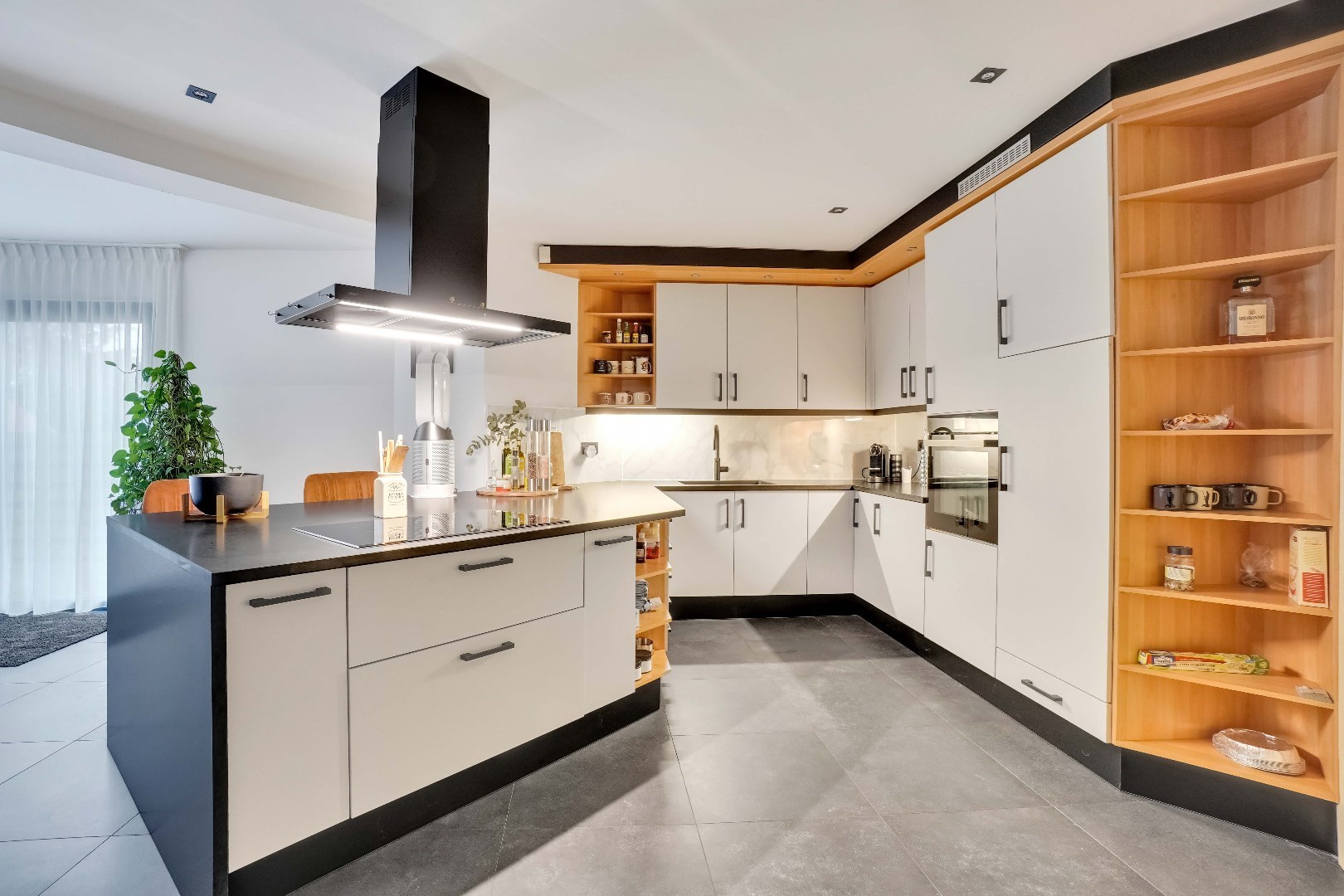 Vanuit de woonkamer betreedt u de moderne, volledig uitgeruste keuken met een inductiekookplaat, vaatwasser, oven en cooker. Hierachter bevindt zich een uitnodigende zit- en eetkamer met een gashaard en uitzicht op de fraai aangelegde tuin.