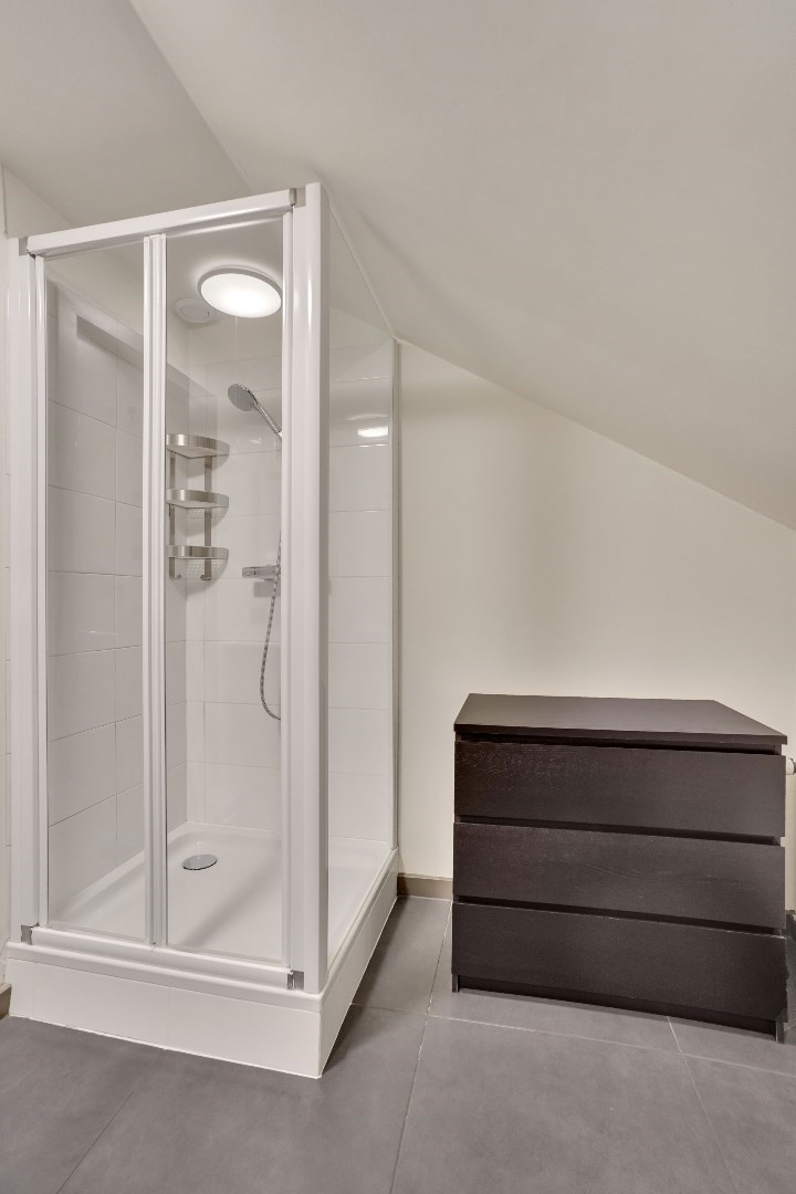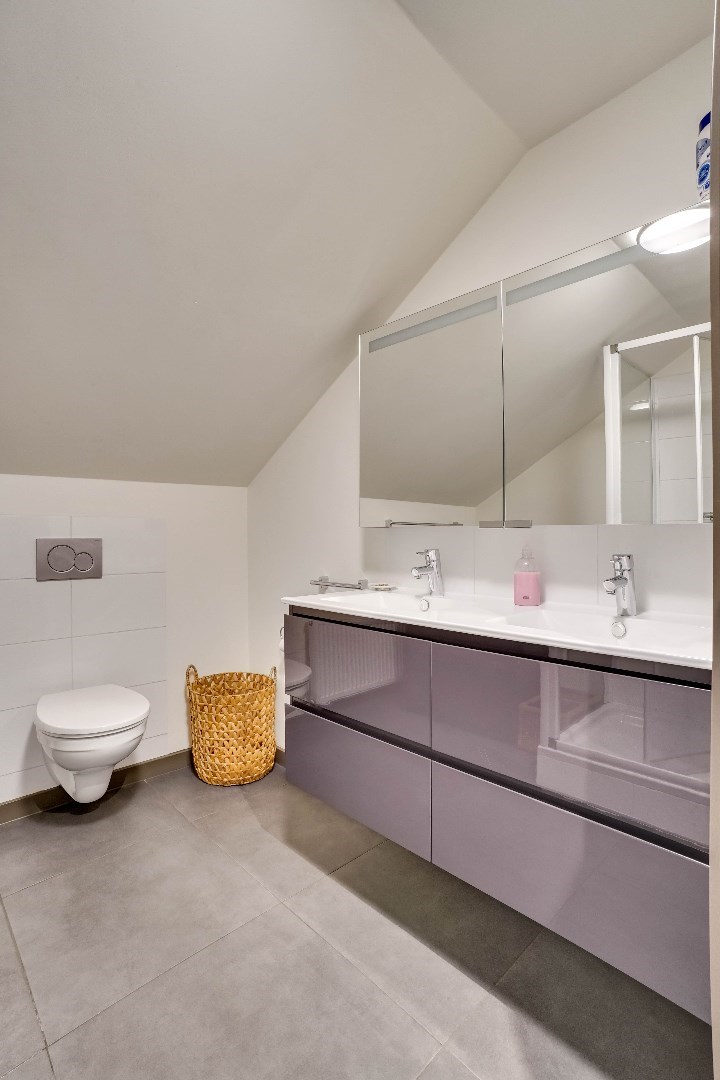 De eerste verdieping biedt een ruime ontspanningsruimte die momenteel wordt gebruikt als zit- en eetkamer, compleet met een tweede keuken. Verder zijn er 2 slaapkamers, elk met een eigen inloopkast. Bovendien vinden we op deze verdieping ook een badkamer terug met een dubbele wastafel, inloopdouche en toilet.