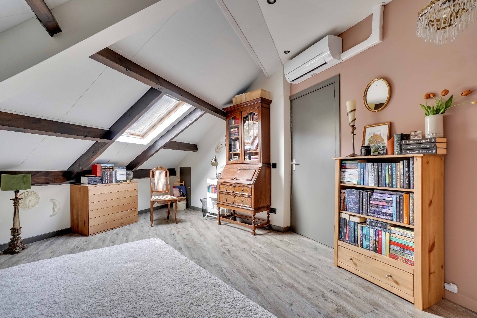 De ruime, sfeervolle woonkamer is voorzien van een gashaard en een prachtige erker, dewelke zorgt voor een overvloed aan natuurlijk licht. Aansluitend is er een kantoorruimte die ook perfect dienst kan doen als speelkamer, hobbyruimte, etc.