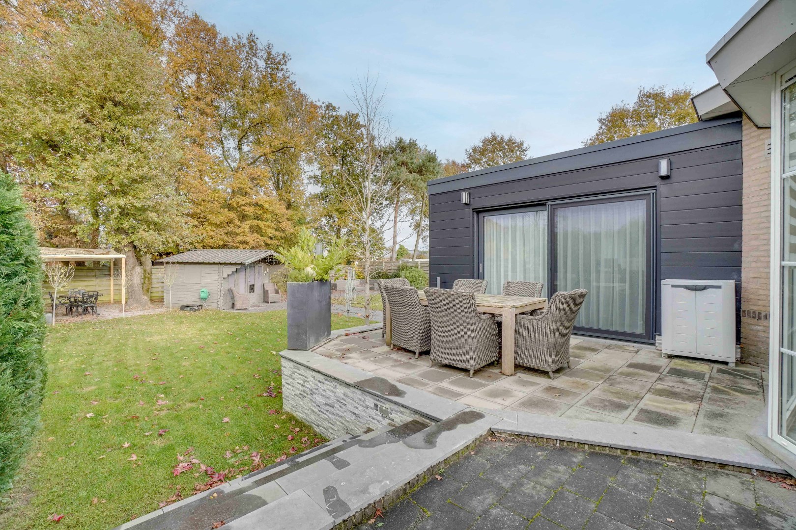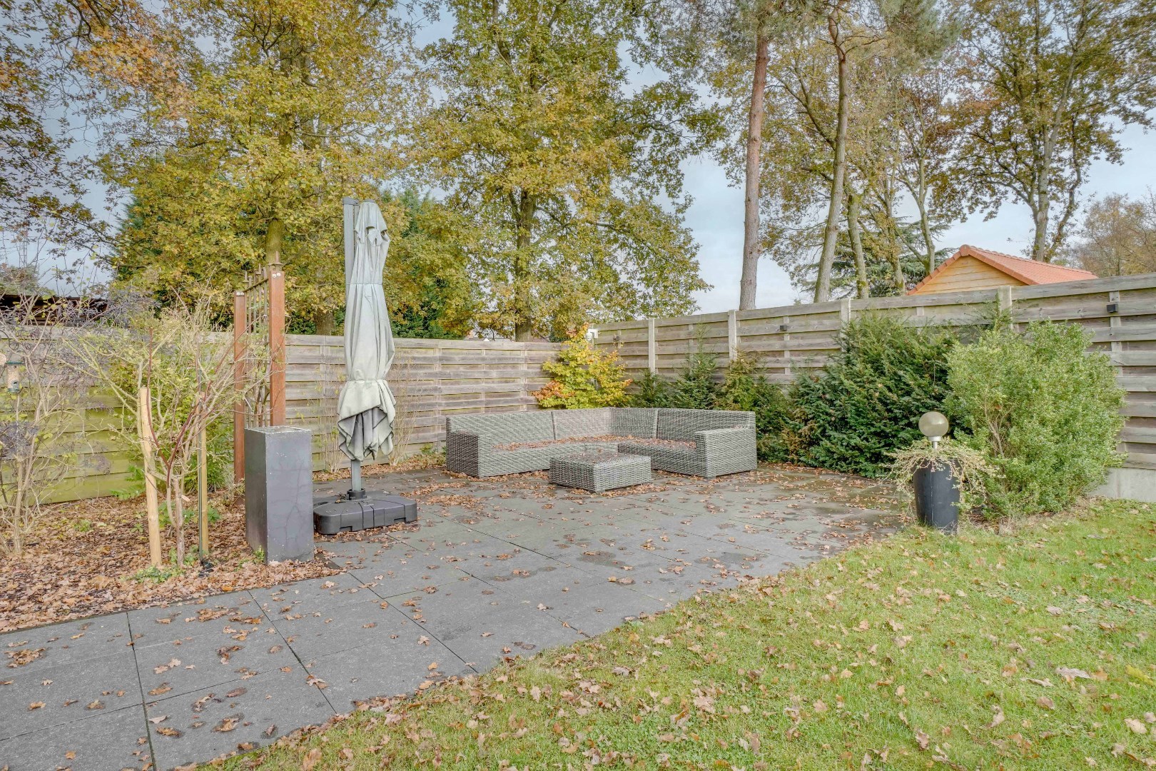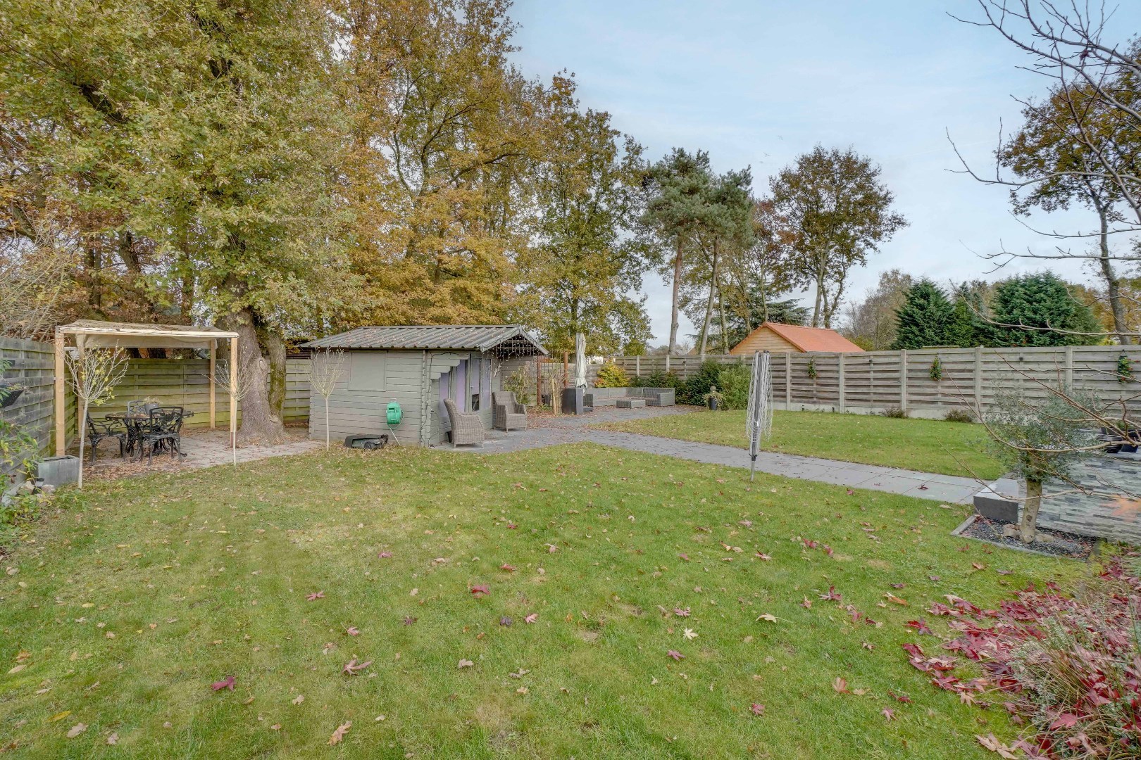 De tuin is prachtig aangelegd met meerdere terrassen, waarvan één overdekt is, waardoor men doorheen het hele jaar kan genieten van de buitenruimte. Daarnaast vindt u hier een praktisch tuinhuis en een jacuzzi terug.