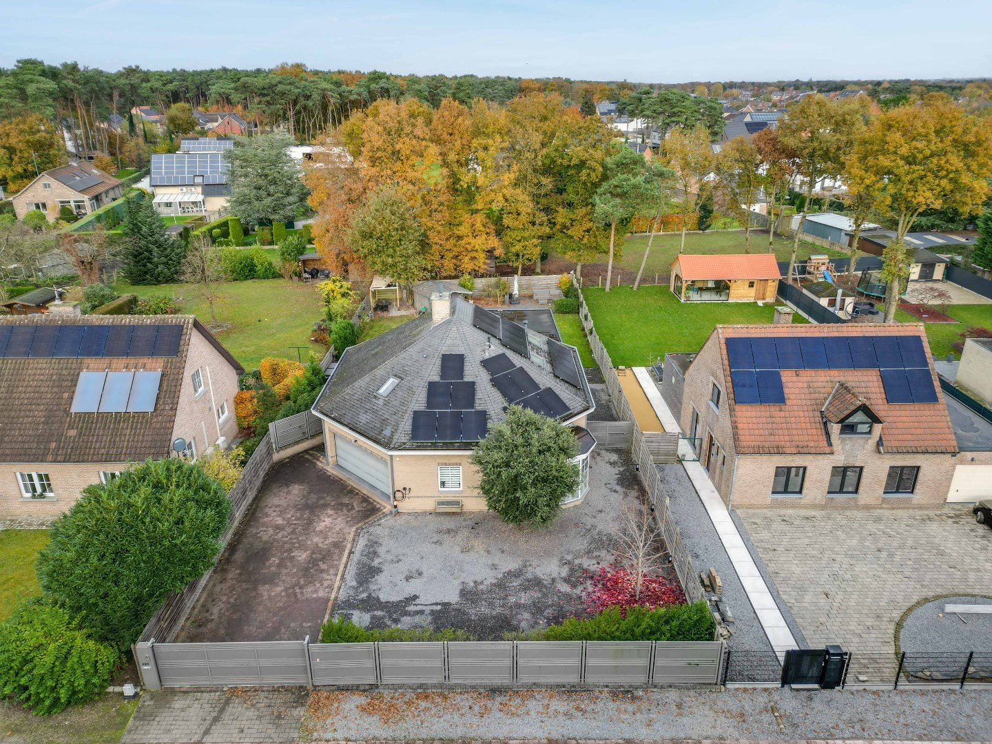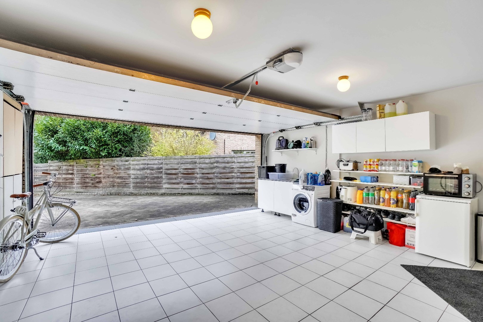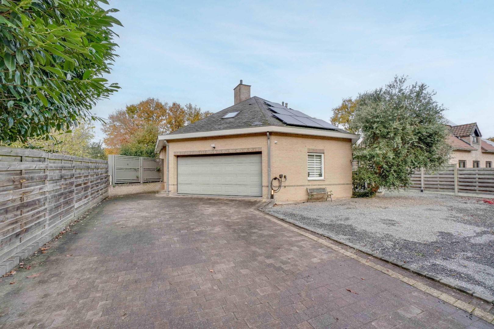De woning beschikt over een dubbele garage met spoelbak en laadpaal, geschikt voor 2 voertuigen en extra opbergruimte. Het volledig omheinde perceel, inclusief elektrische poort, biedt maximale privacy en veiligheid.