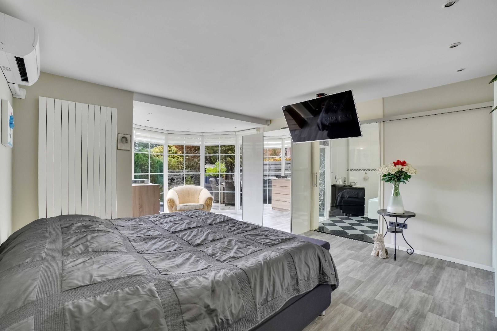 Op de begane grond ligt tevens de master bedroom van maar liefst 30 m², voorzien van een ensuite badkamer met dubbele wastafel, ligbad, douche en toilet.