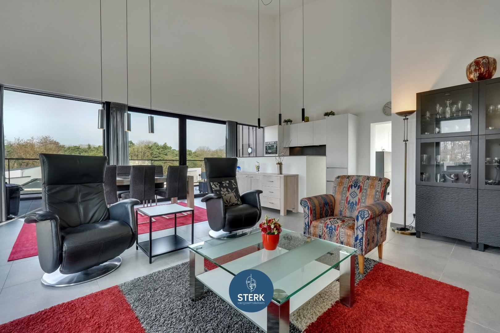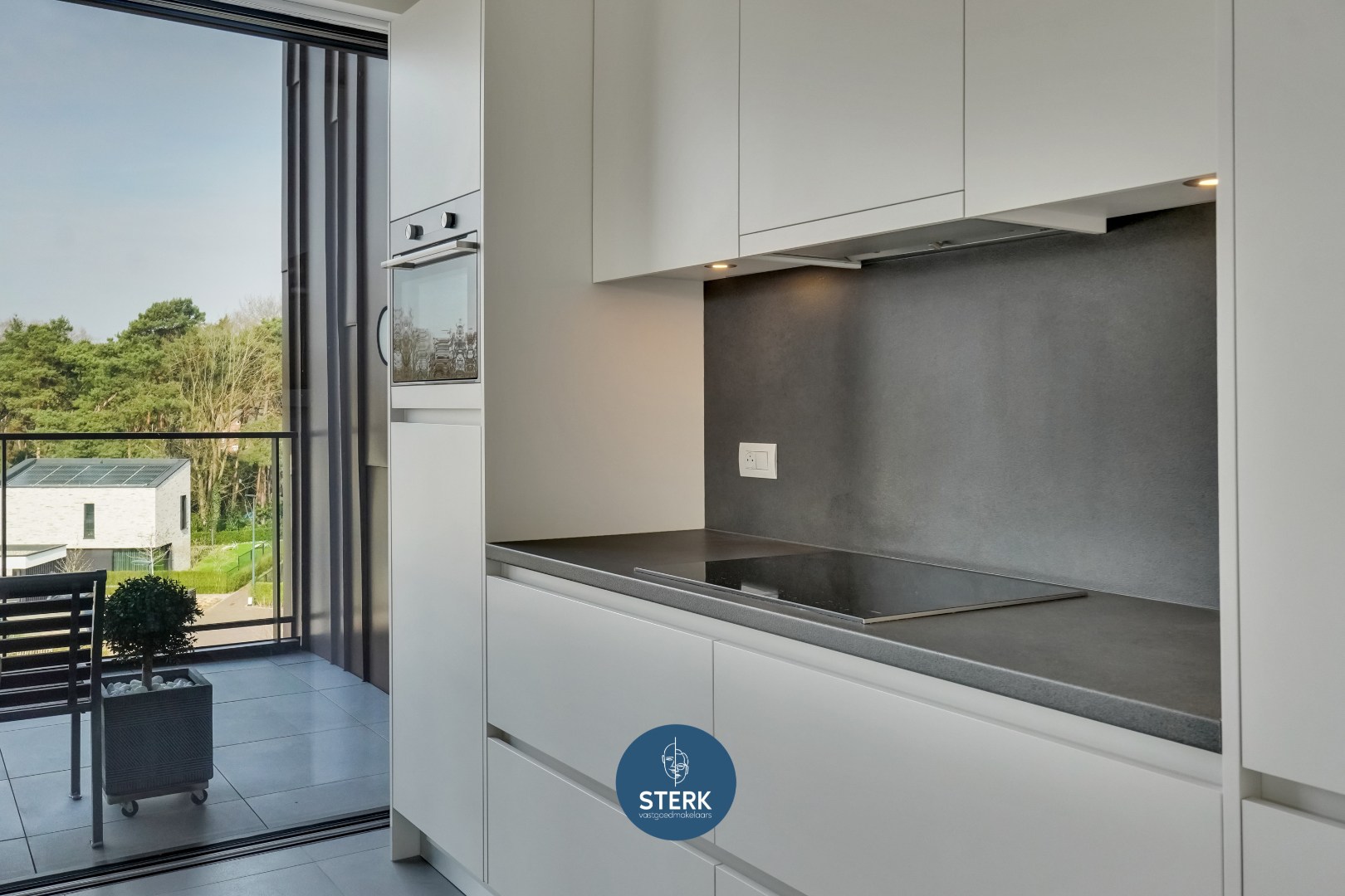 De open keuken sluit naadloos aan op de leefruimte en is uitgerust met kwalitatieve toestellen, waaronder een inductie kookplaat, ingebouwde koelkast en combi-oven. Het kookeiland met zitgelegenheid maakt deze ruimte niet alleen praktisch, maar ook bijzonder gezellig en uitnodigend.