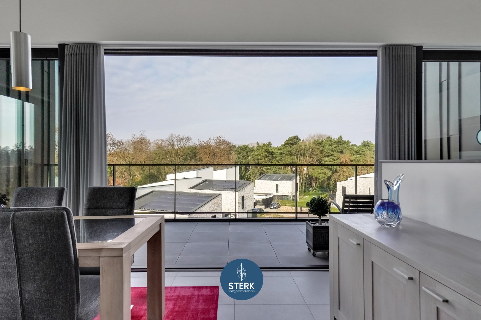 Aan de achterzijde van het appartement bevindt zich een ruim terras, georiënteerd op het zuid-oosten. Dit maakt het penthouse bijzonder aantrekkelijk voor wie de hele dag wil profiteren van de zon.