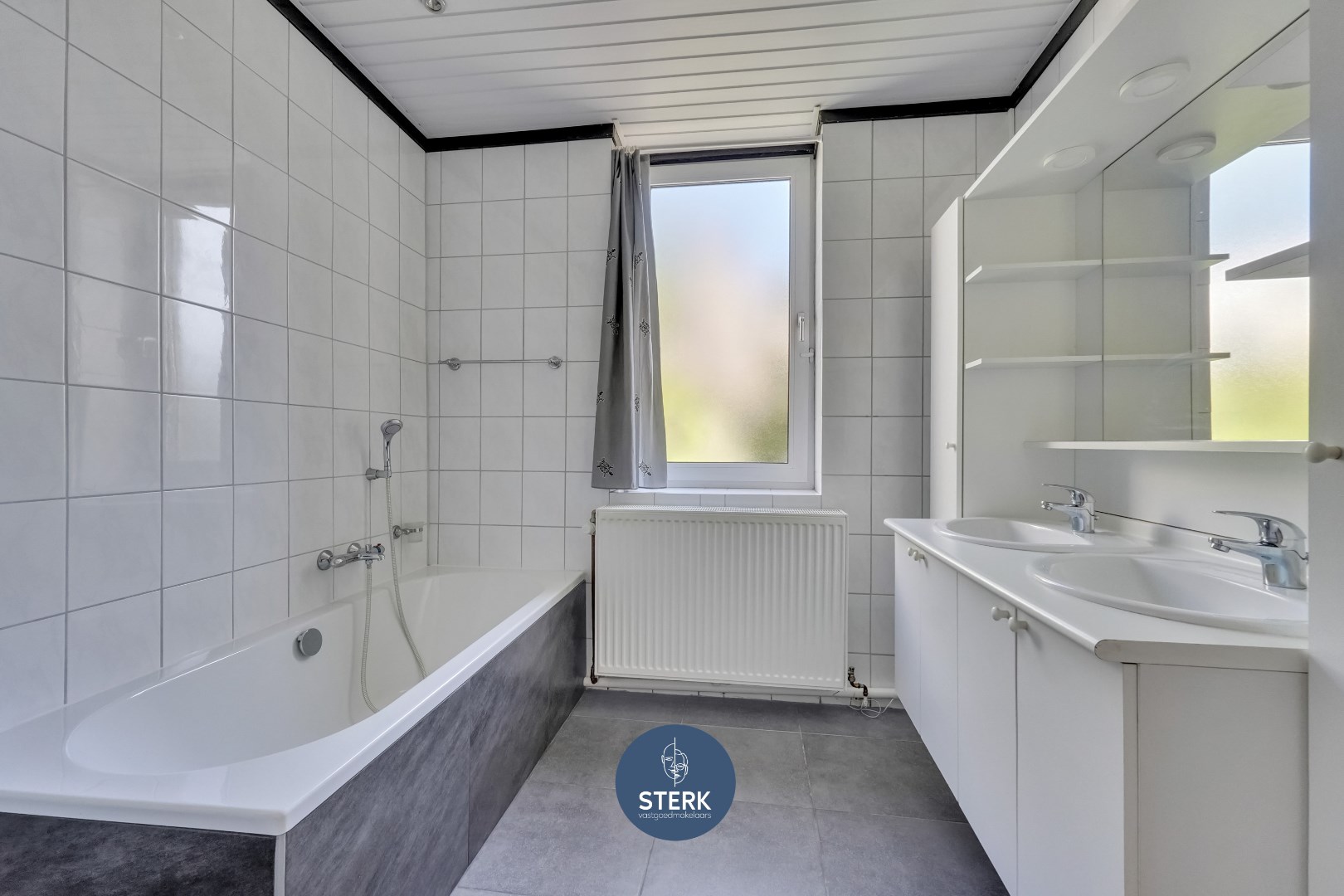 Bovendien vinden we op het gelijkvloers de badkamer terug, dewelke uitgerust is met een dubbele lavabo, ligbad en douche.