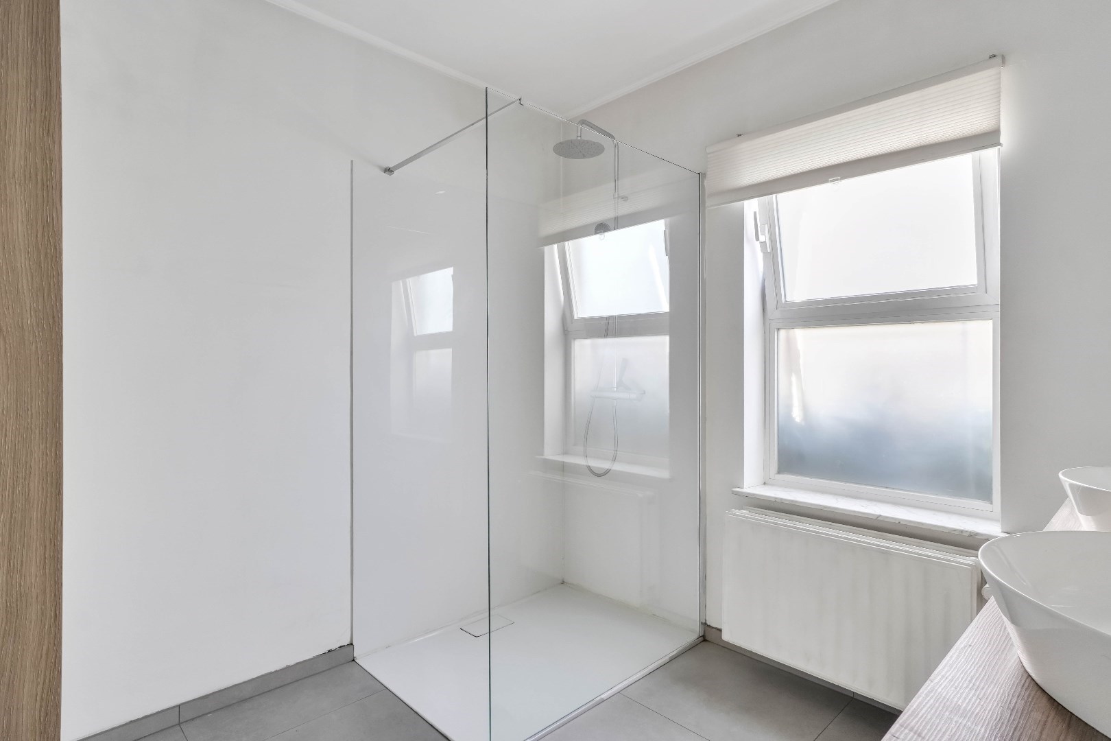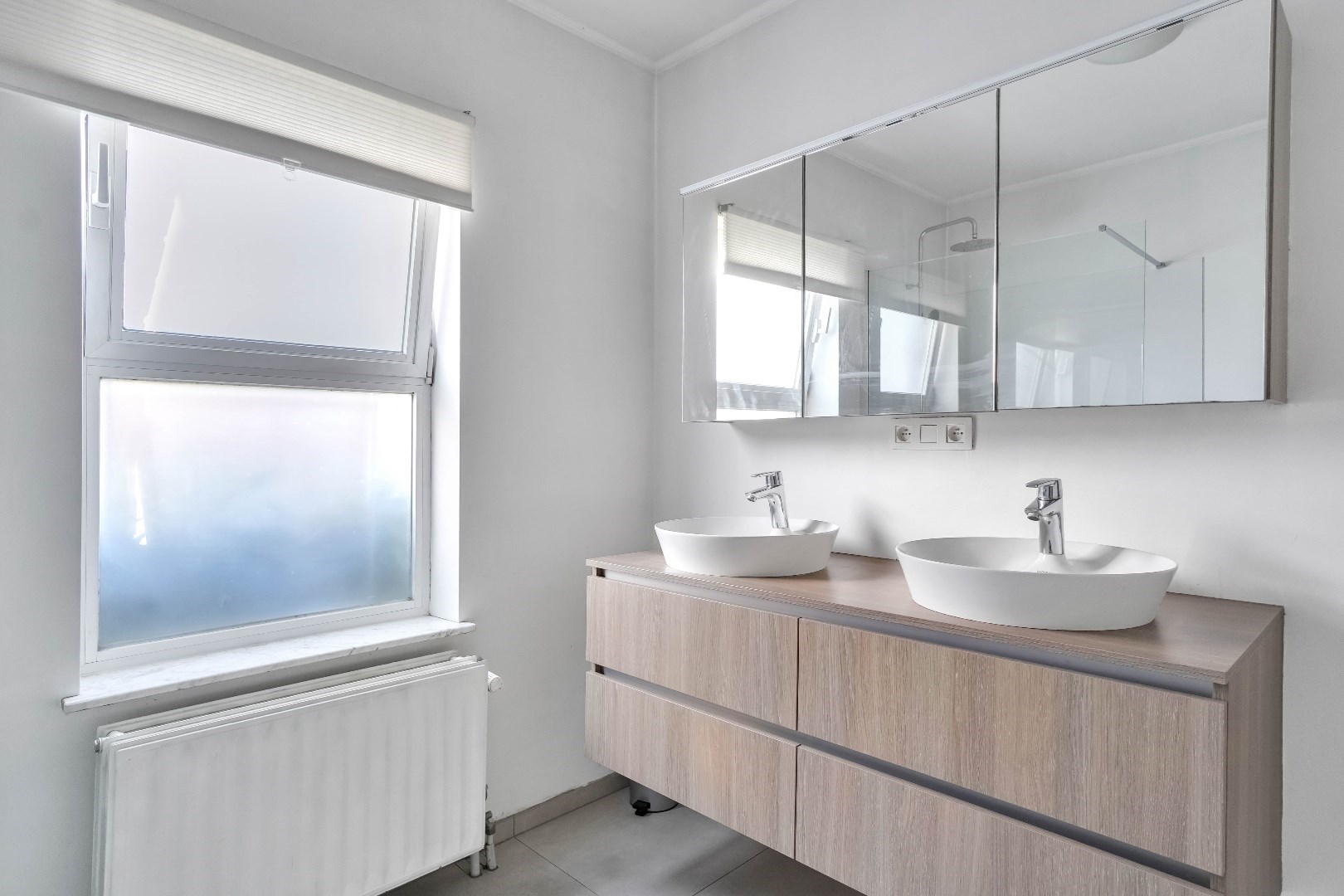 Verder is er op het gelijkvloers een slaapkamer van 16 m² en een badkamer aanwezig, waardoor het mogelijk is om volledig gelijkvloers te wonen. De badkamer beschikt over een dubbele lavabo en praktische inloopdouche.