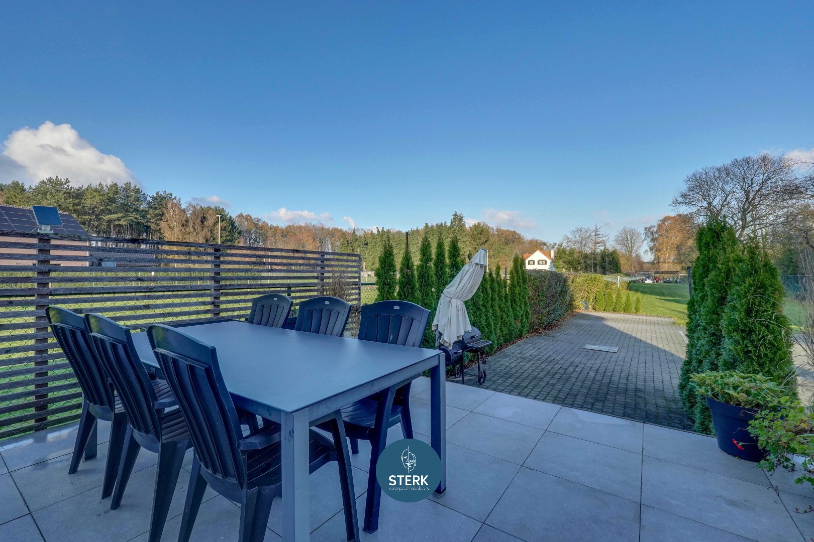 Achteraan de woning bevindt zich een mooi uitgestrekte tuin met veel privacy en groen rondom. Aan de woning grenst een ruim terras met zonneluifel, ideaal om te genieten van zomerse dagen of om schaduw te creëren wanneer gewenst. Verder is er een carport achteraan in de tuin, wat een handige overdekte parkeerplaats of opslagmogelijkheid biedt.