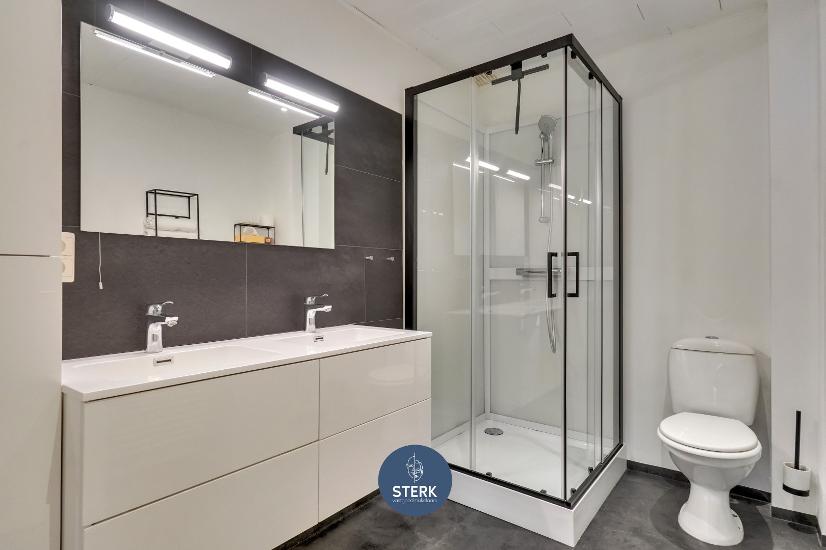 dubbele lavabo, douche en toilet.