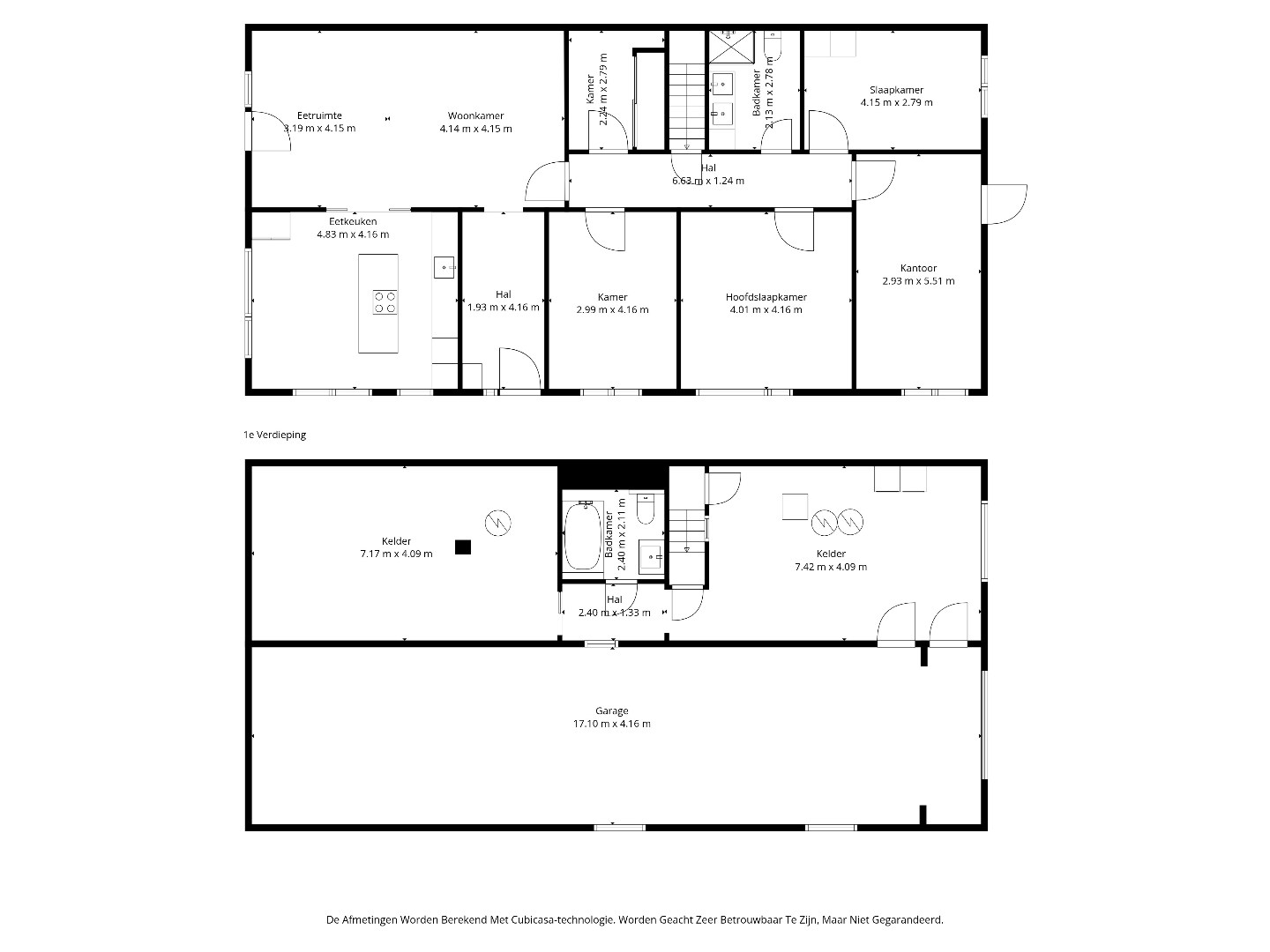 Onder de woning bevindt zich een uitzonderlijk ruime kelderverdieping. Hier vindt men een enorme garage van circa 17m op 4m met plaats voor meerdere wagens, alsook extra berging en voorraadruimte. In de kelder is een tweede badkamer aanwezig, ingericht met wastafel, ligbad en toilet.